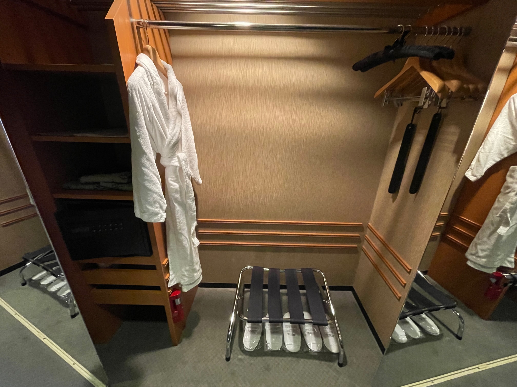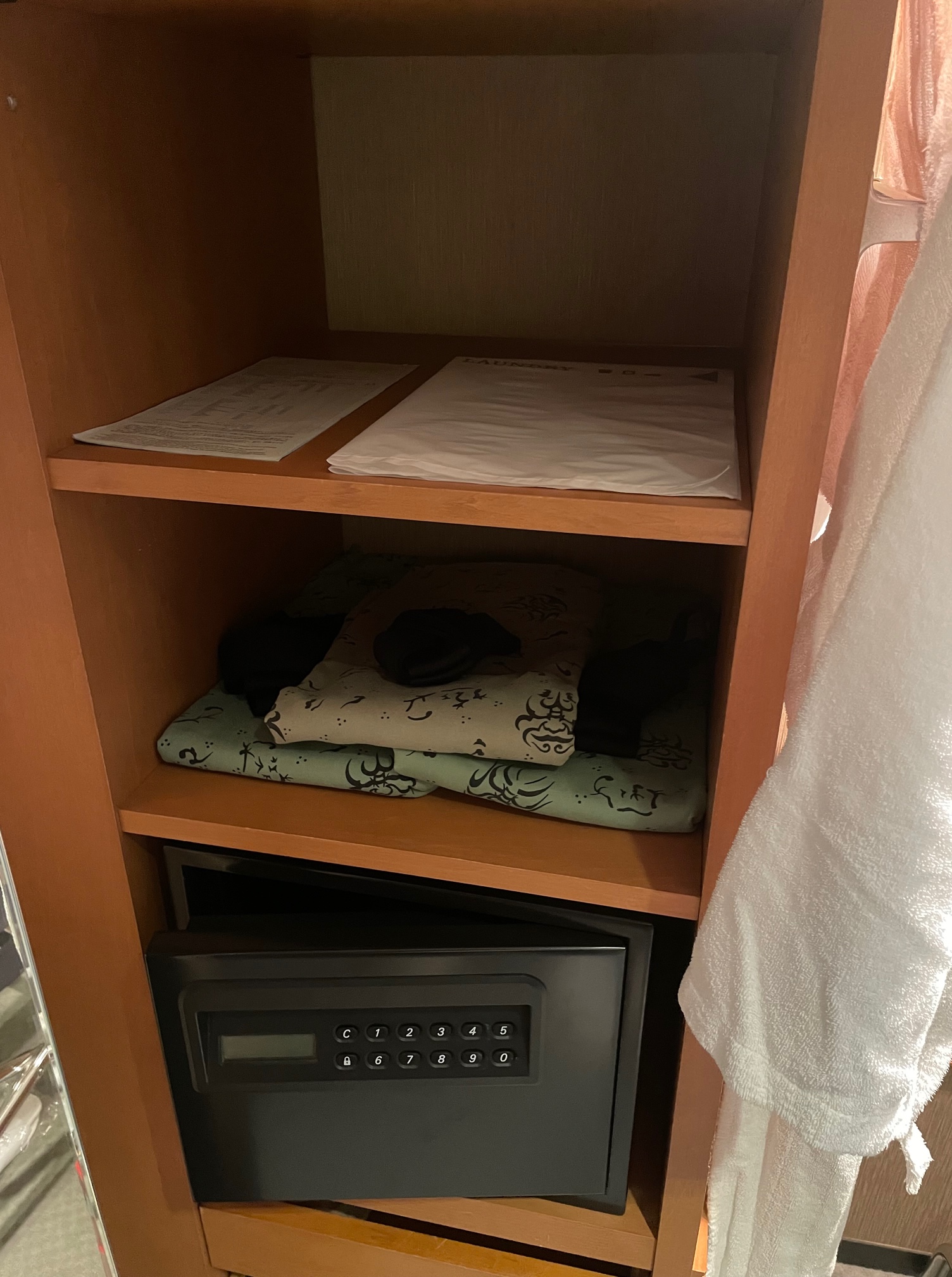 左手の棚にはランドリーバッグ、浴衣(子供用?)、セーフティボックス