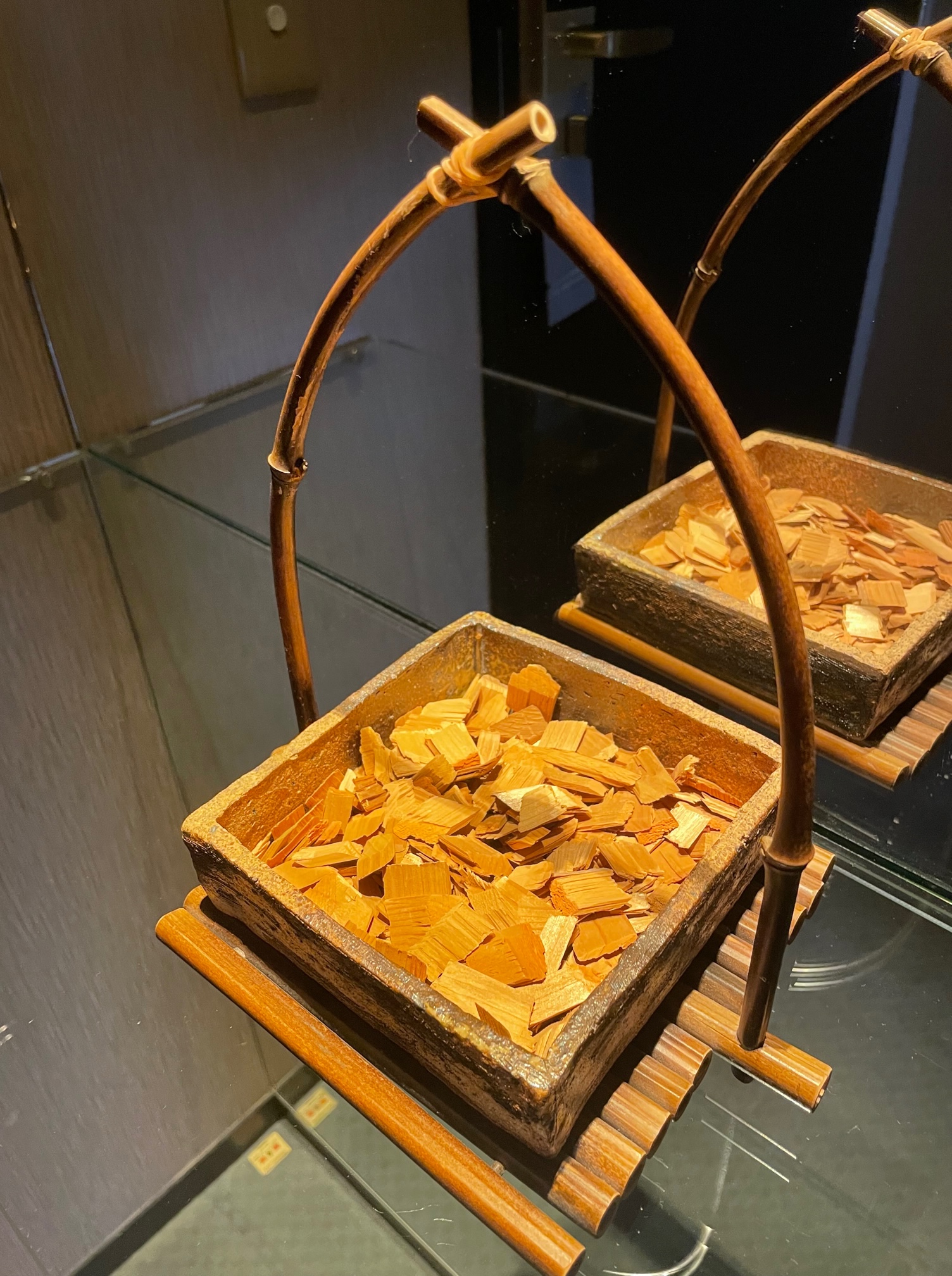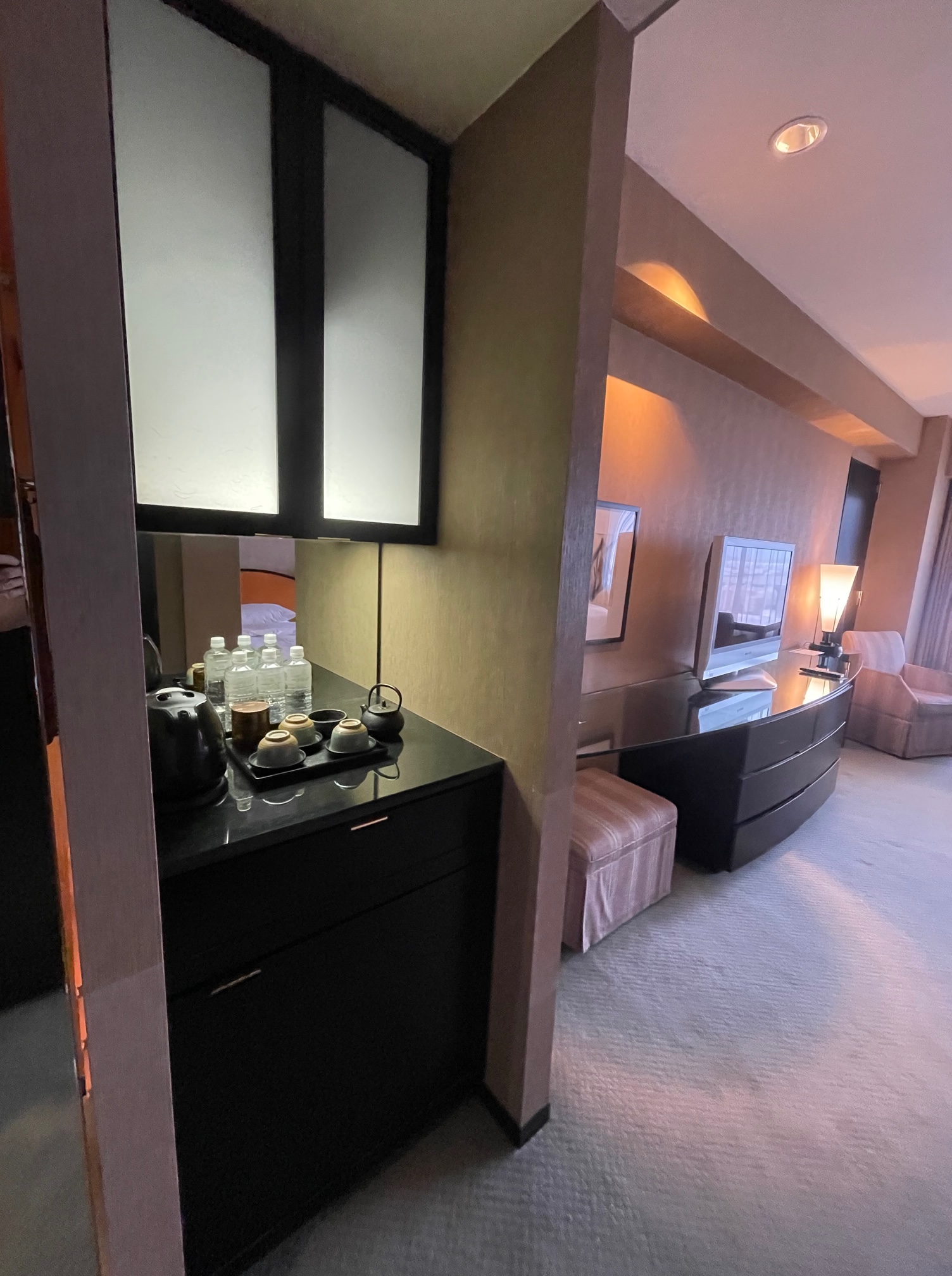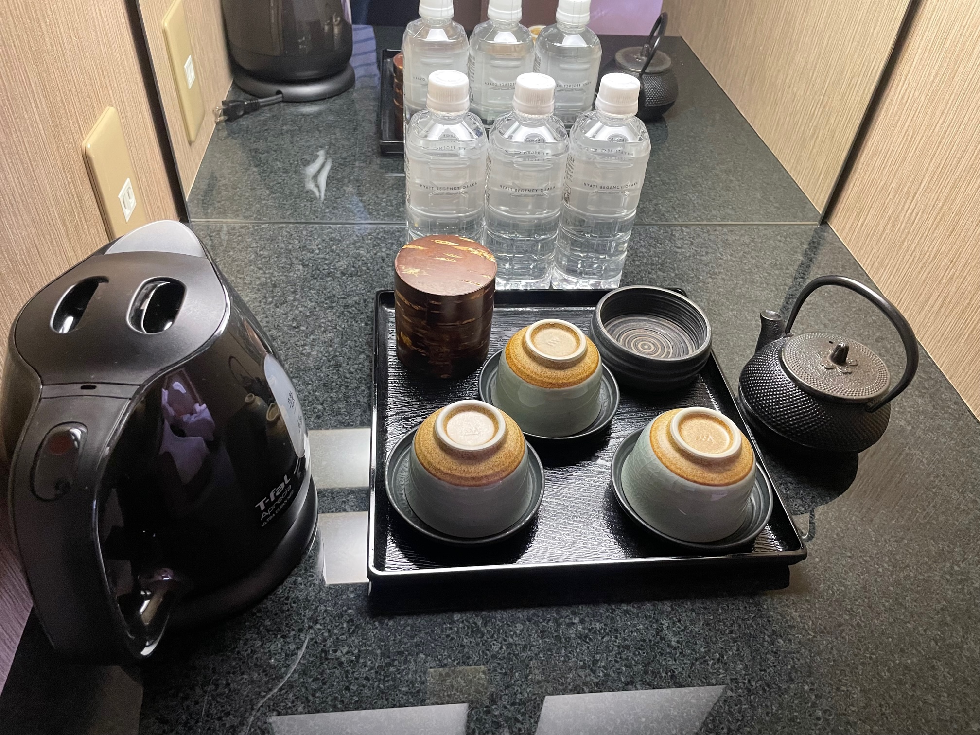 上には電気ケトル、急須や茶わん、サービスのミネラルウォーターが置かれています