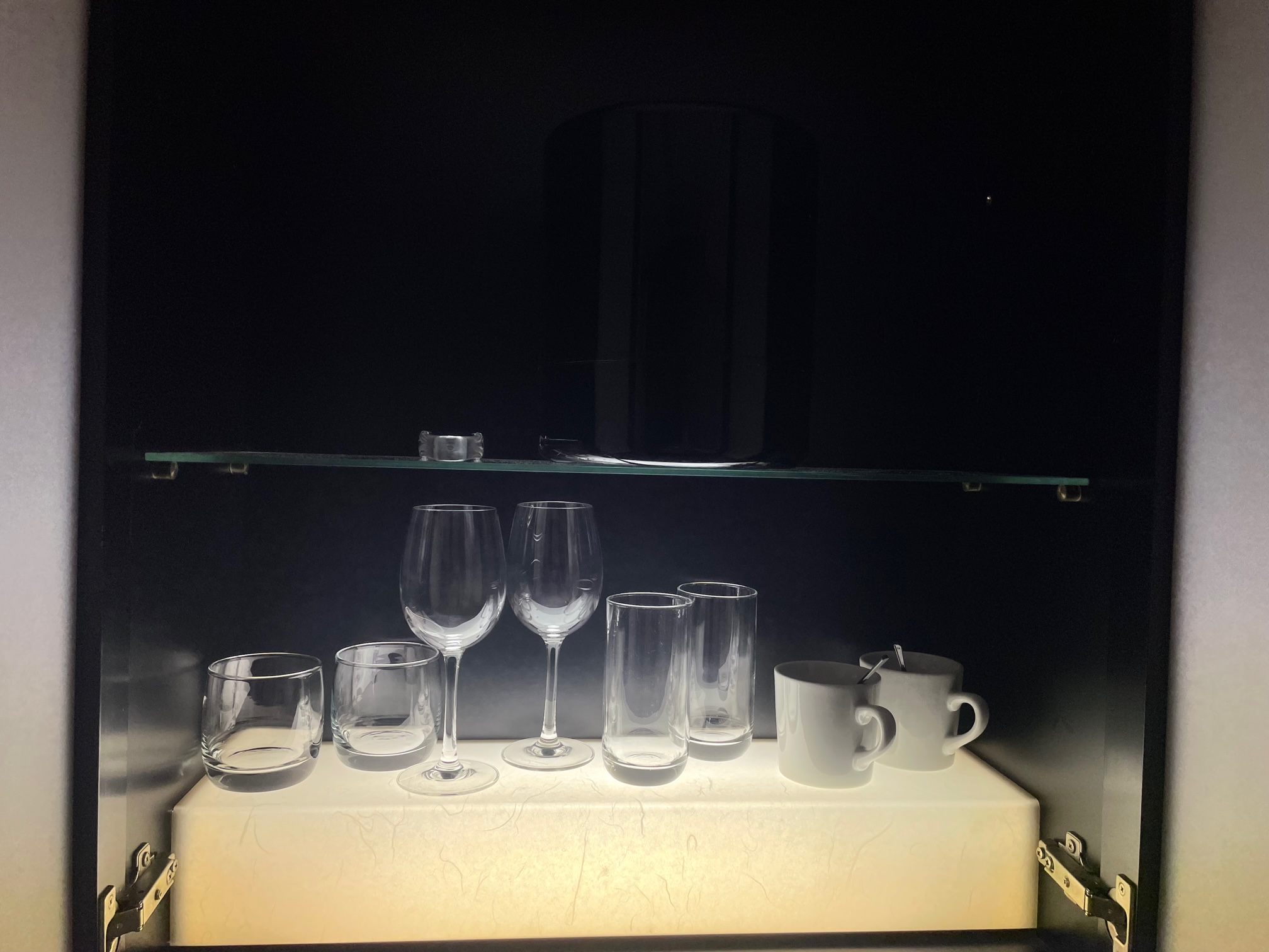 頭上の棚にはグラスやマグカップ、ワイングラスなど