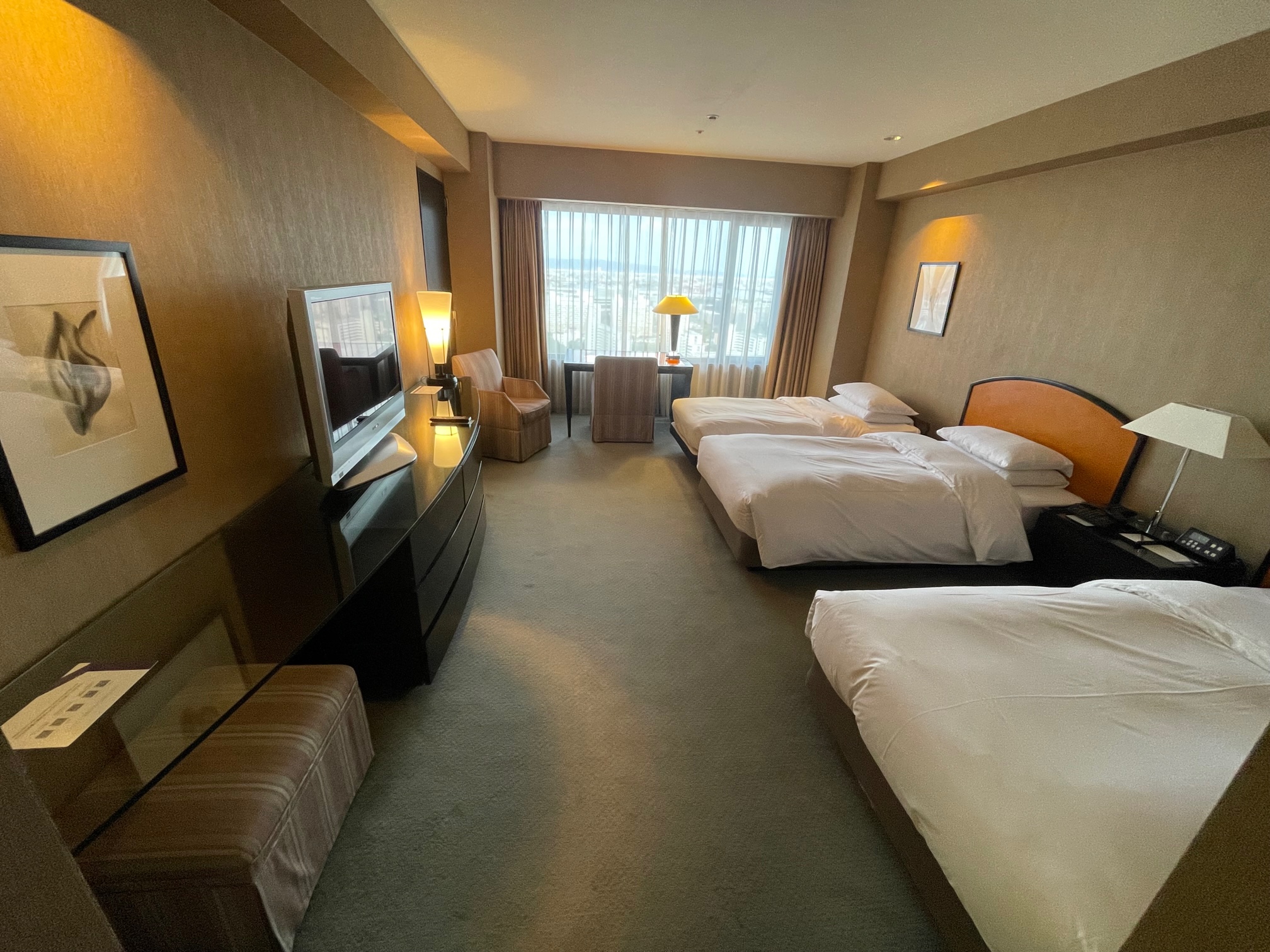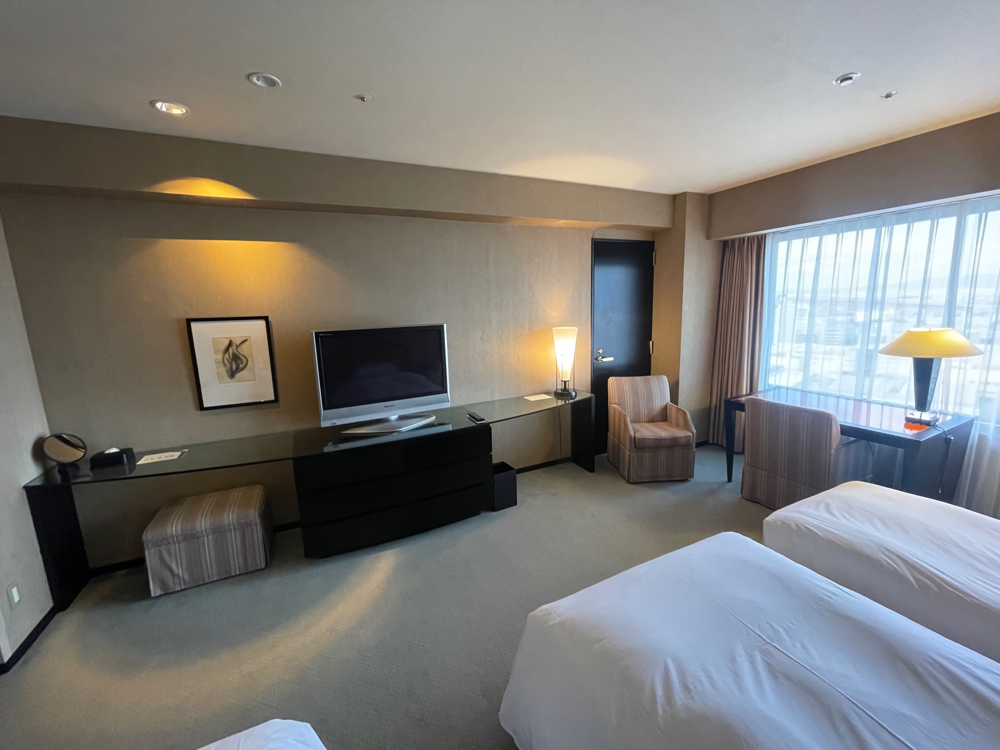 ハイアットリージェンシー大阪リージェンシークラブデラックスツインに宿泊しましたので室内の様子をご紹介します。内装は古いですが水回り含めメンテナンスはしっかりされており、クラブラウンジも利用できて値段の割には満足できる滞在でした。屋外プールやBBQビアガーデンも楽しめてよい夏休みでした!