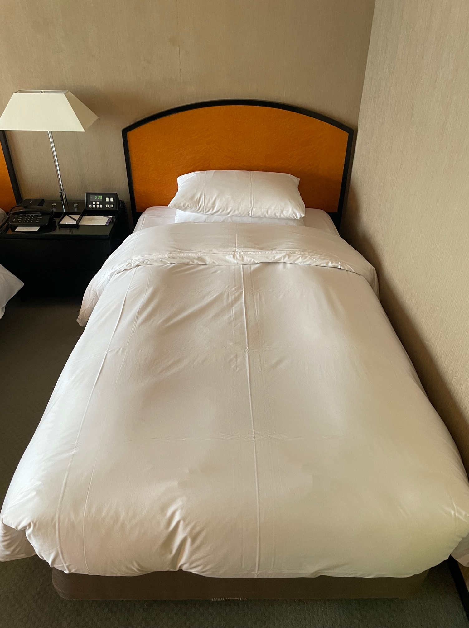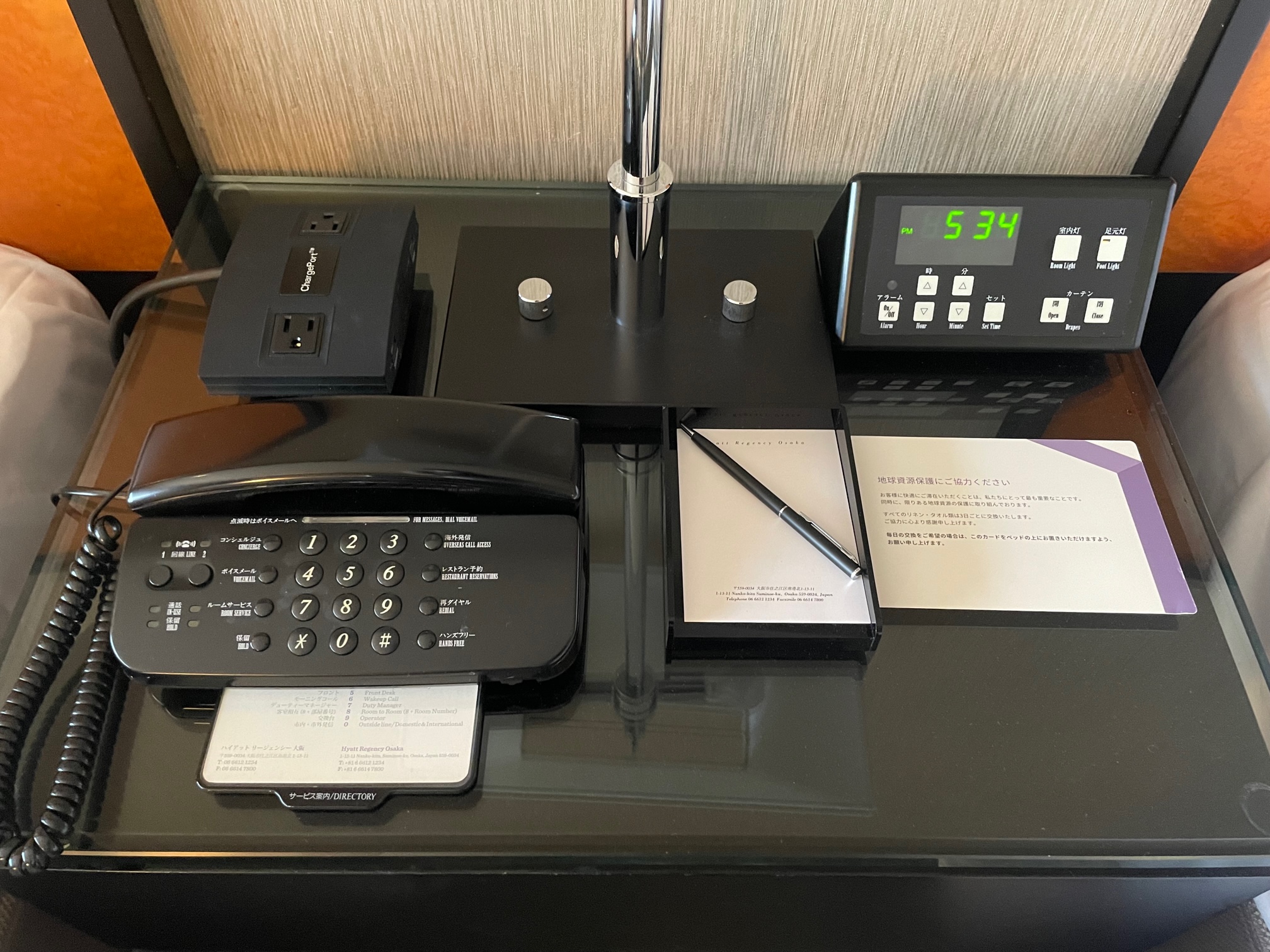 ナイトテーブルには電話、メモ帳、目覚まし時計と一体となった照明やカーテンのスイッチ、コンセント×2口が置かれています