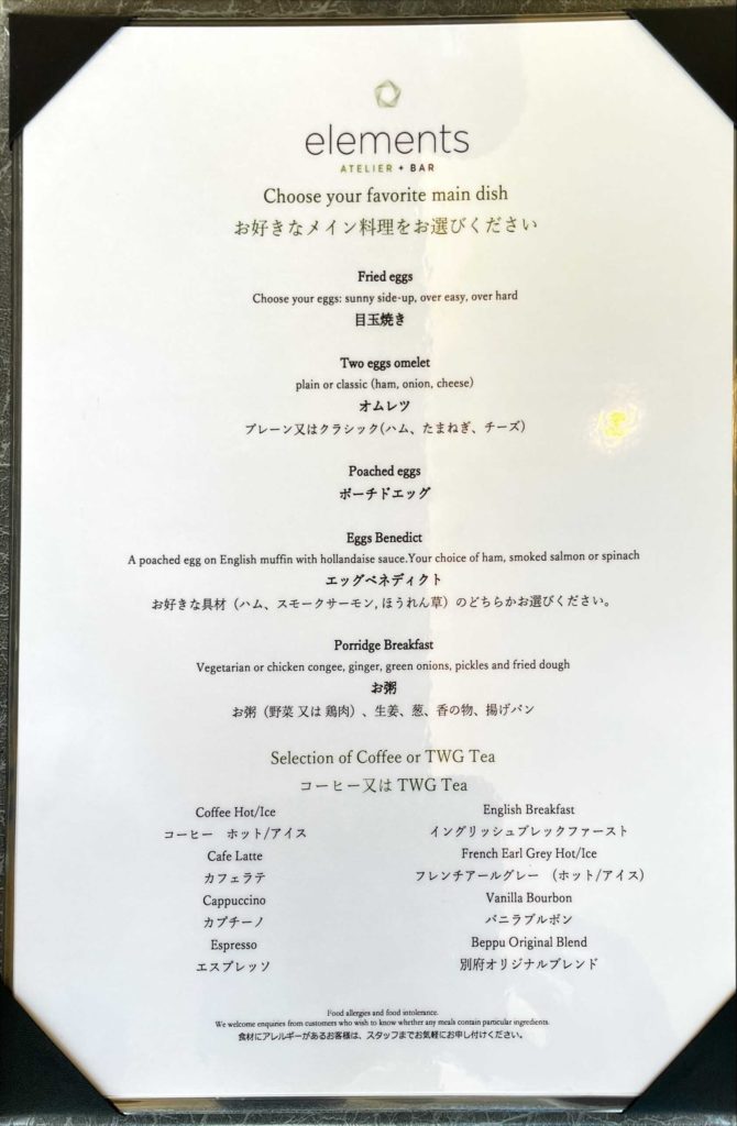 本来はエレメンツで朝食を食べるとクラブラウンジでの朝食を頂くことができません。つまり、エレメンツの朝食ブッフェとクラブラウンジ限定のオーダーメニューの両方を食べることはできないのです。しかし、この日は朝食時間帯はクラブラウンジが閉鎖されており、エレメンツでクラブラウンジ限定のオーダーメニューを注文できましたので、エレメンツのメニューとクラブラウンジ限定メニューの両方を頂くことが可能でした。