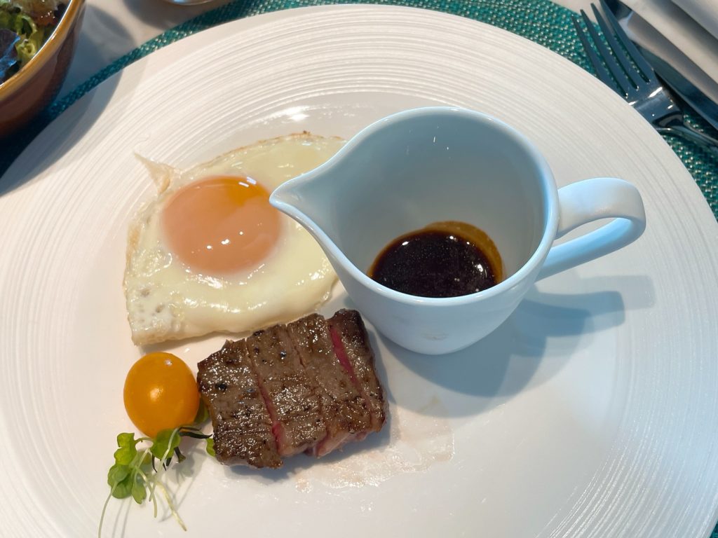 大分サーロインステーキ トマトコンフィ 赤ワインソース 目玉焼き