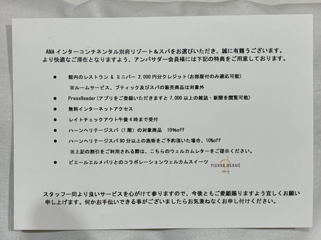 ANAインターコンチネンタル別府リゾート&スパのアンバサダー特典は以下の通りです
