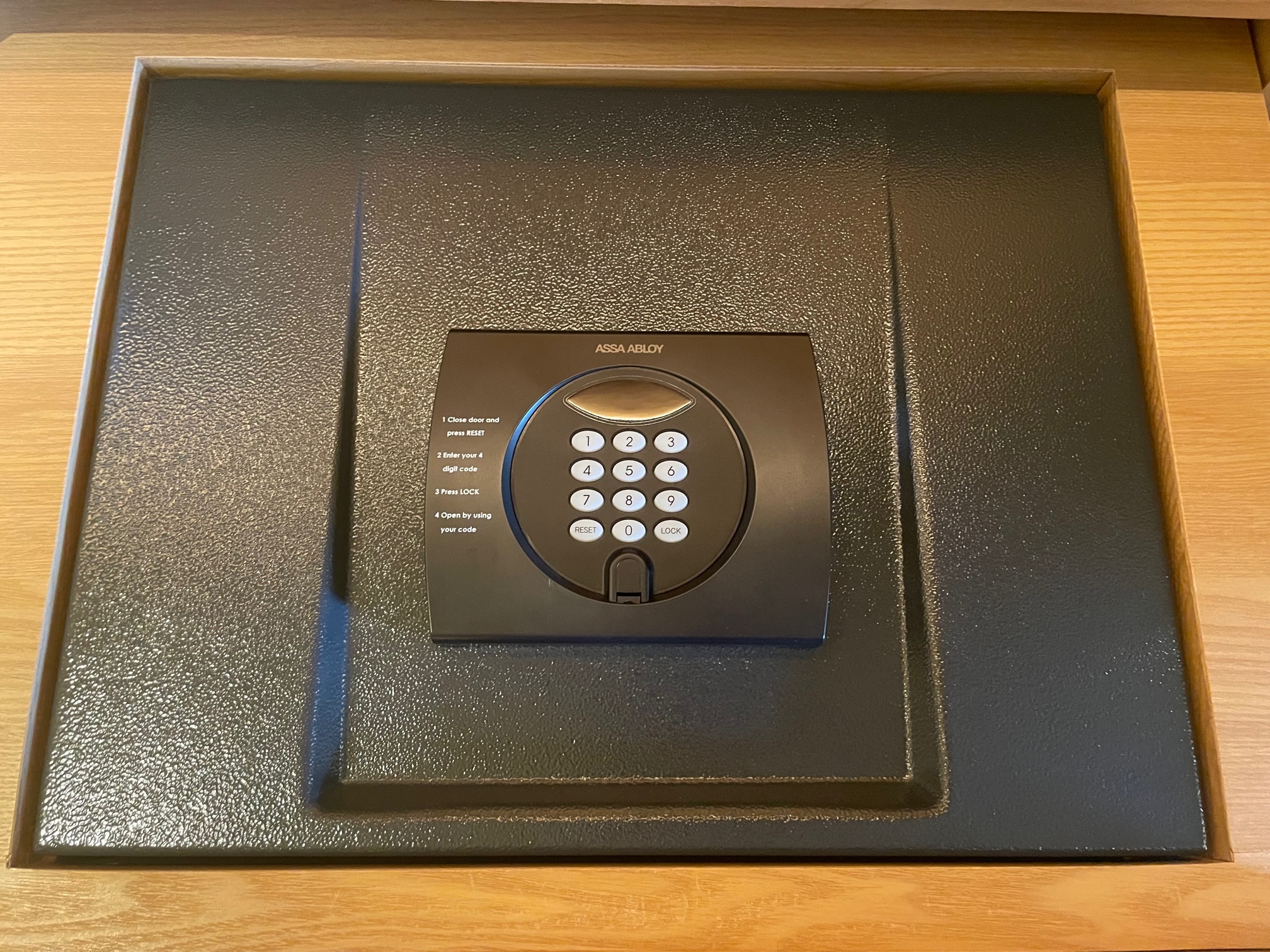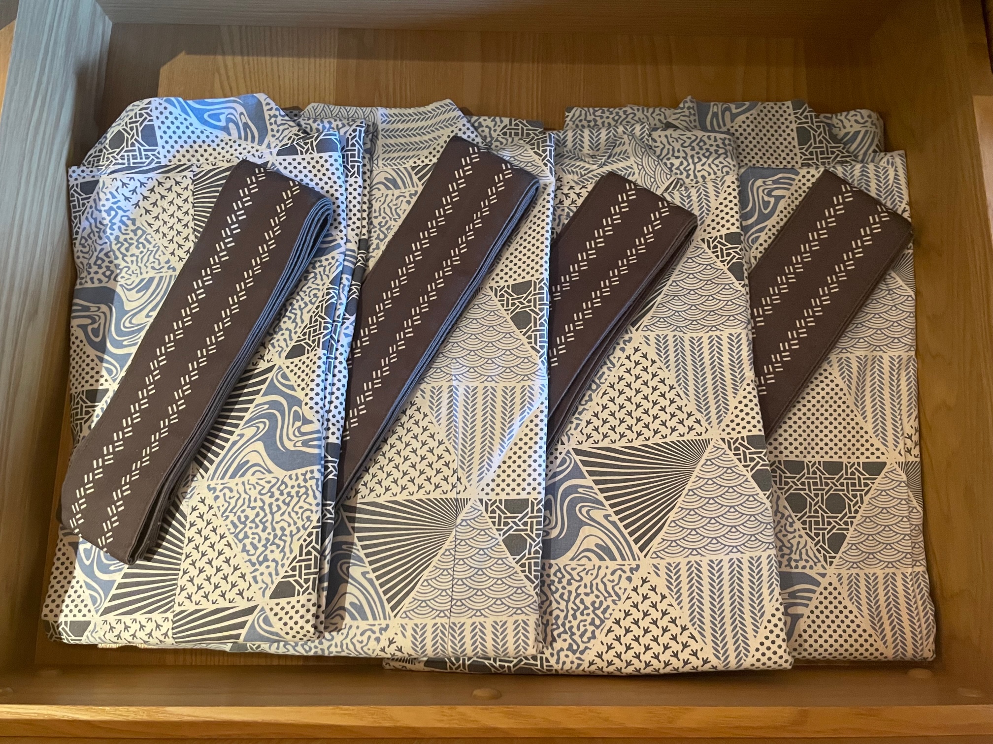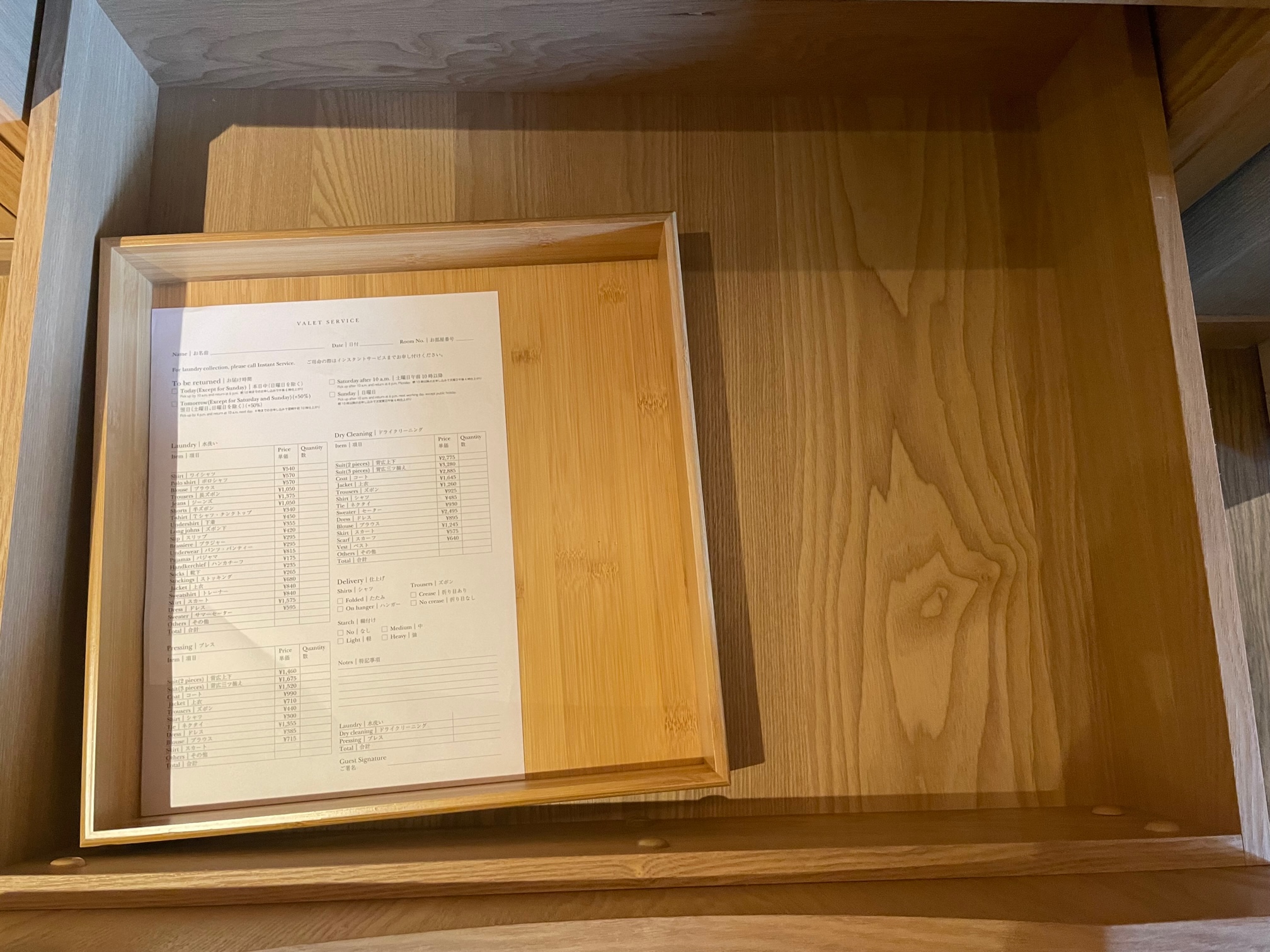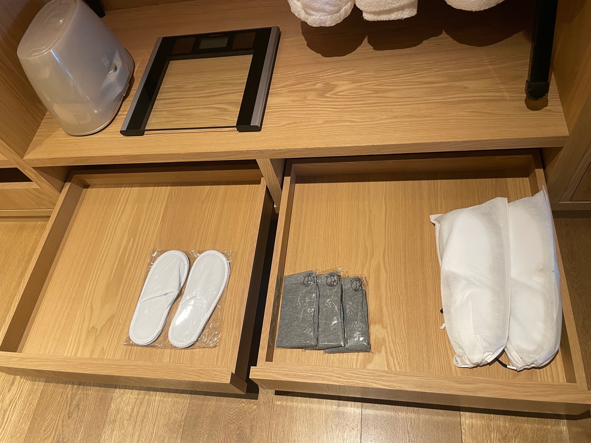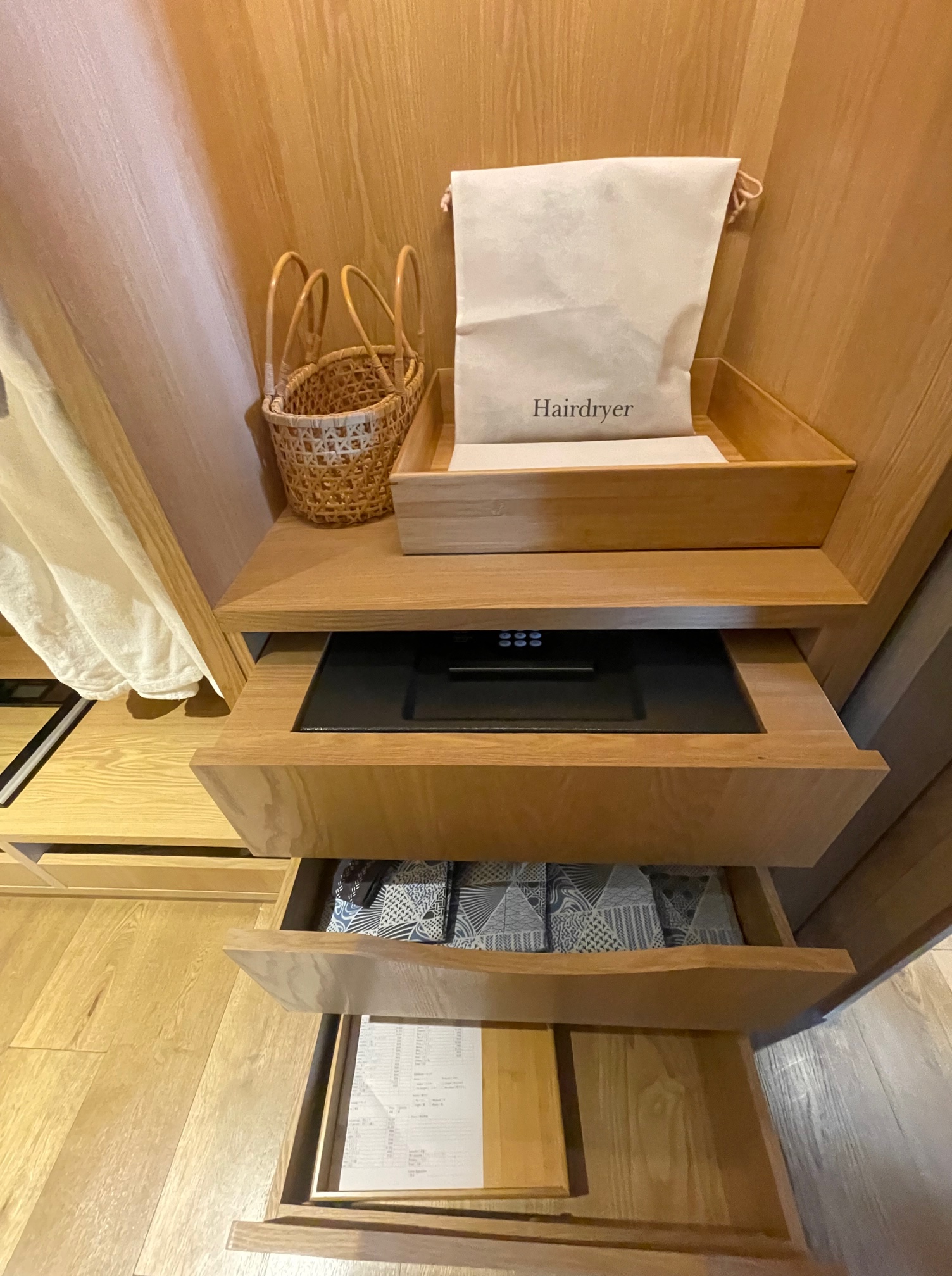 入口側の引き出し上にはかごやドライヤー、引き出しを開けると上段にはセーフティーボックス、中段には浴衣、下段にはランドリー伝票が入っています