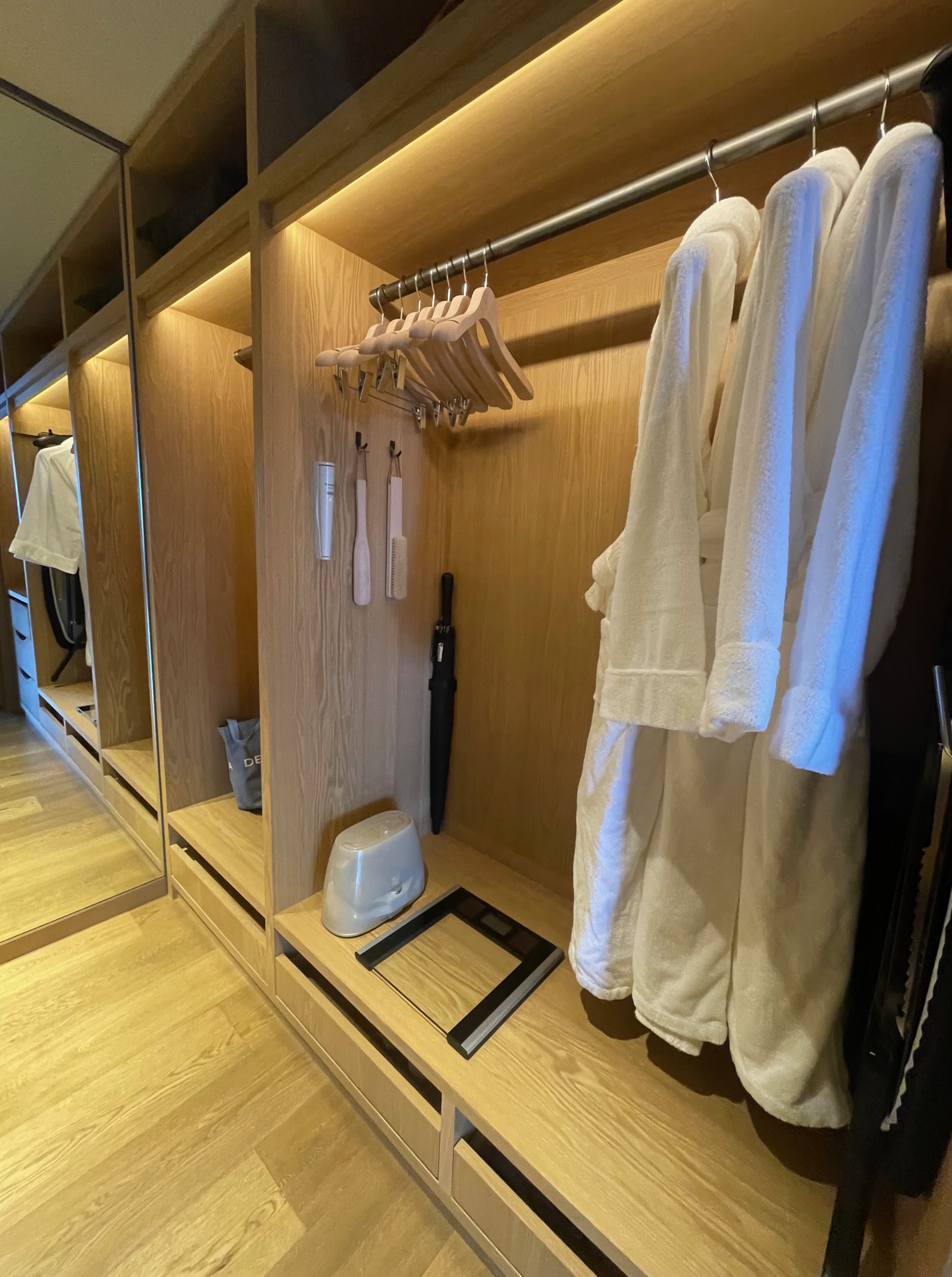 ハンガーも多く、バスローブもかかっています。その他体重計、靴ベラ、ブラシ、傘、アイロンなど