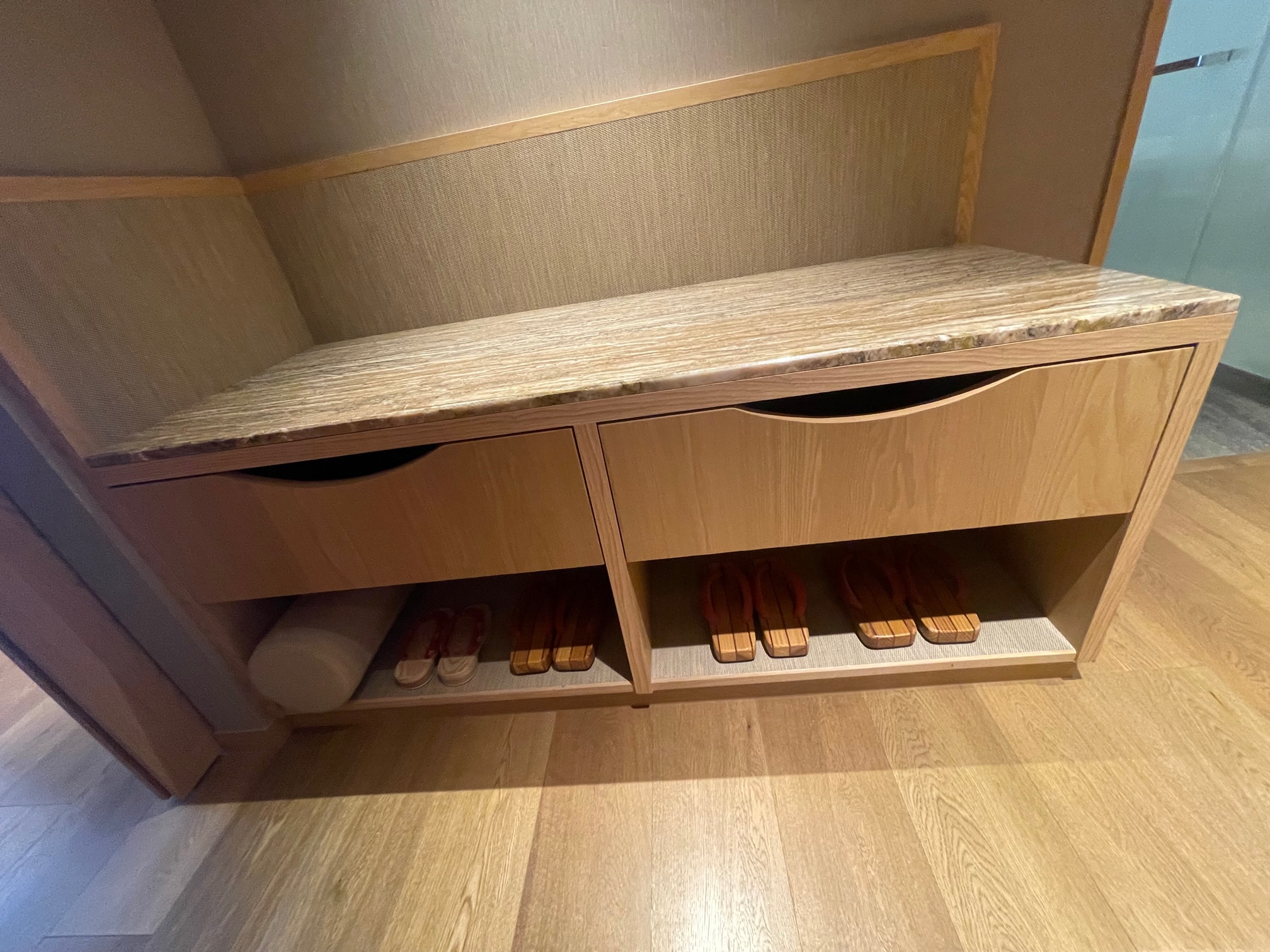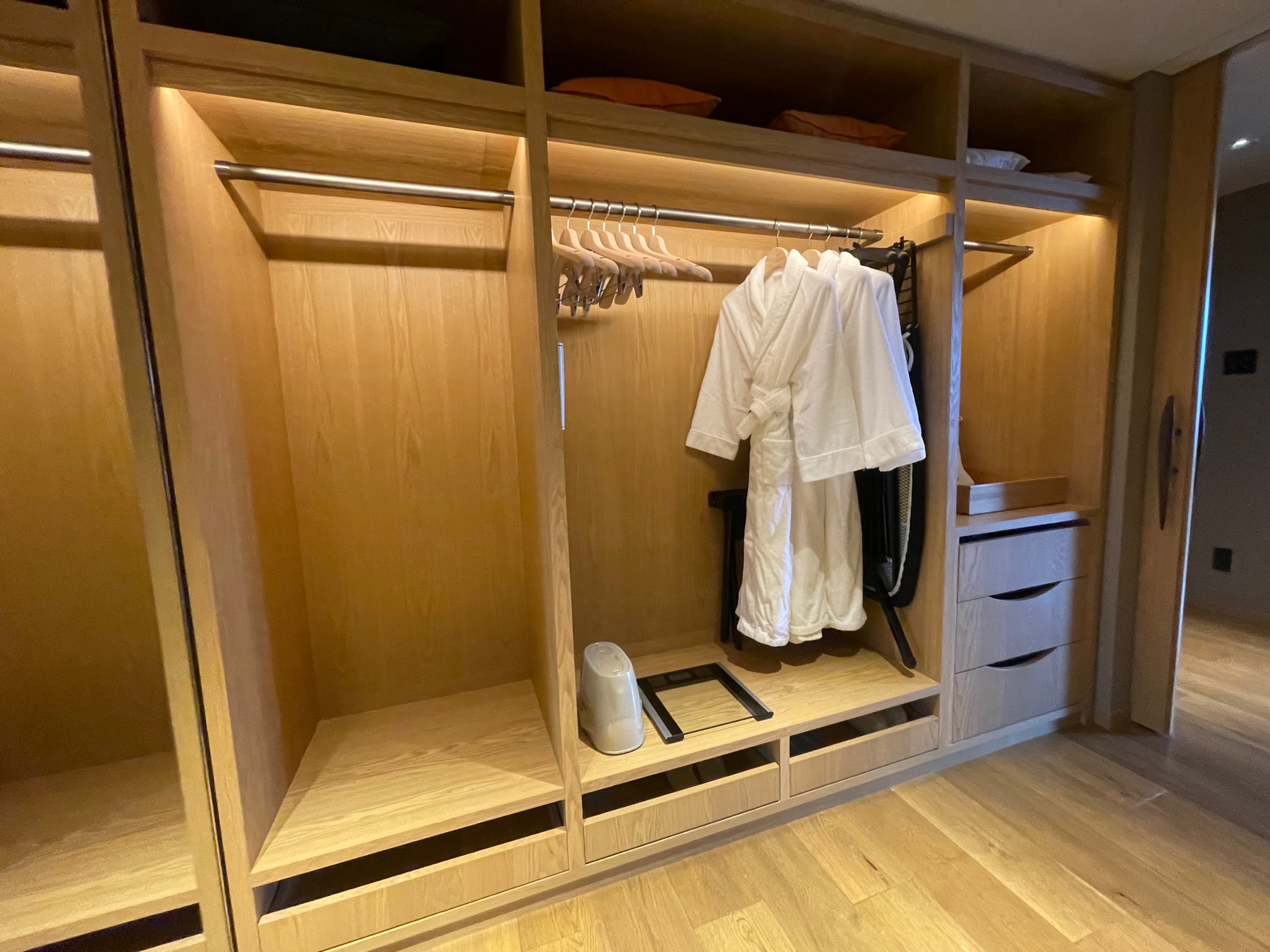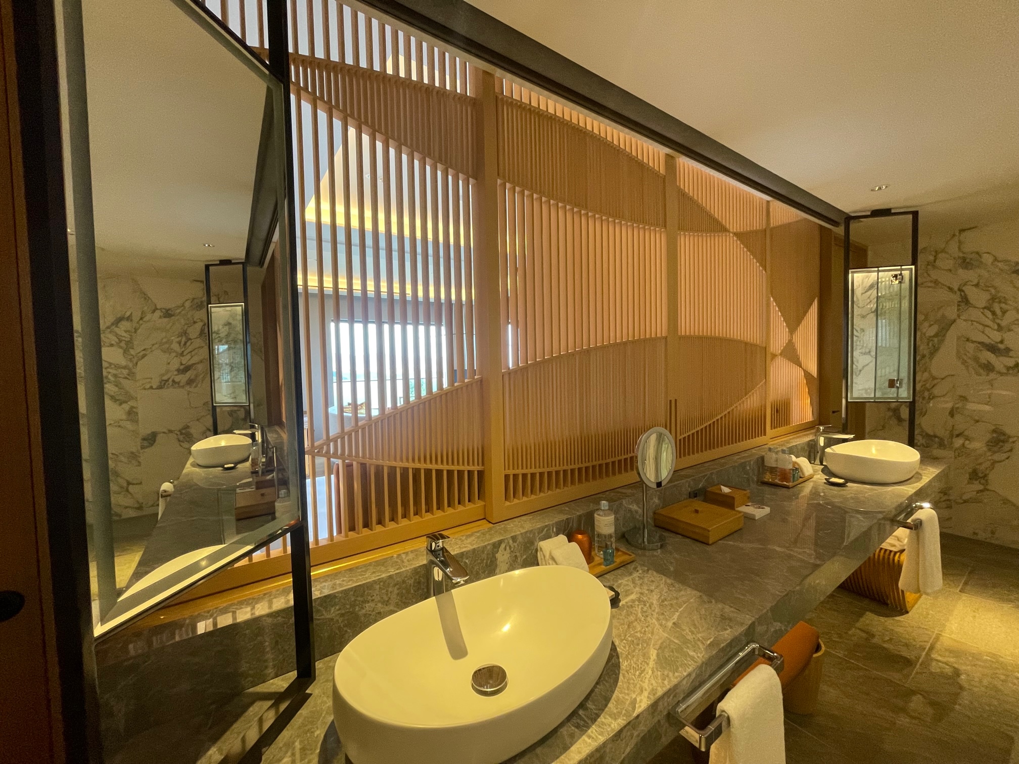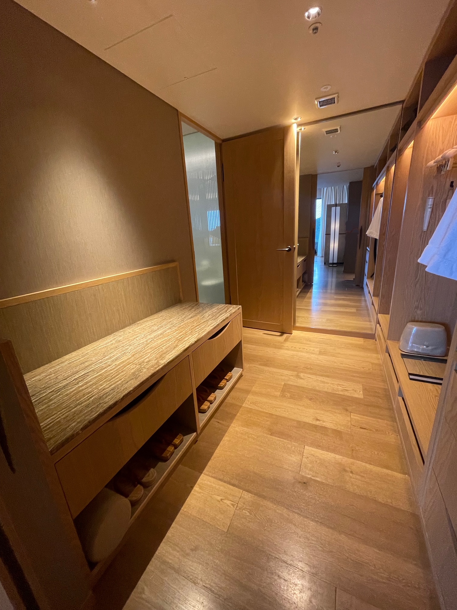 部屋の見取り図がなくお示しできませんが、クローゼット⇔ウェットエリア⇔ベッドルーム⇔リビングルーム⇔クローゼットとぐるぐる回れる動線で、広さも十分で温泉露天風呂もあり個人的にはとても好きな部屋でした。