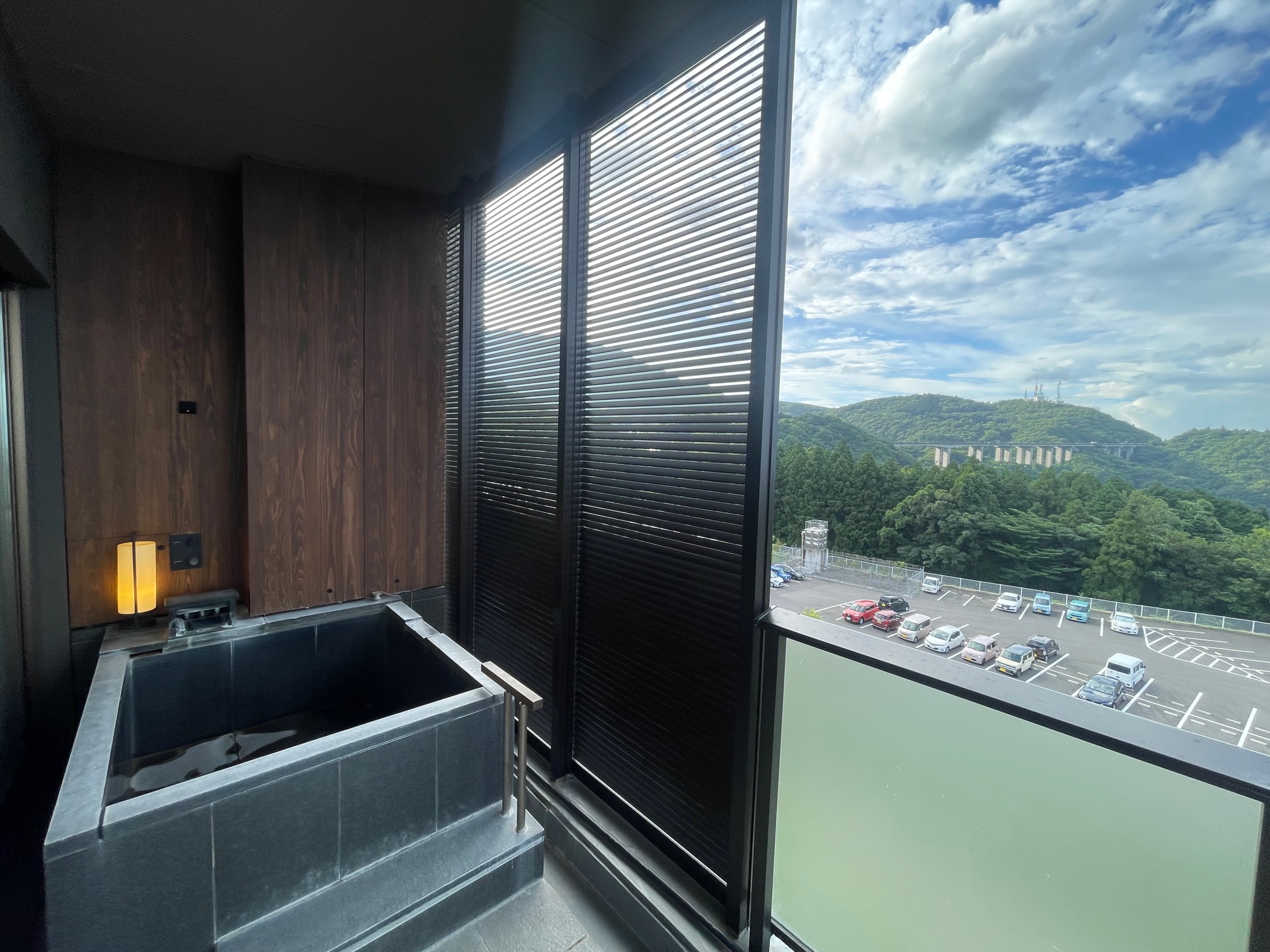 ベランダには温泉露天風呂!ジュニアスイートは駐車場側で眺望は劣りますね