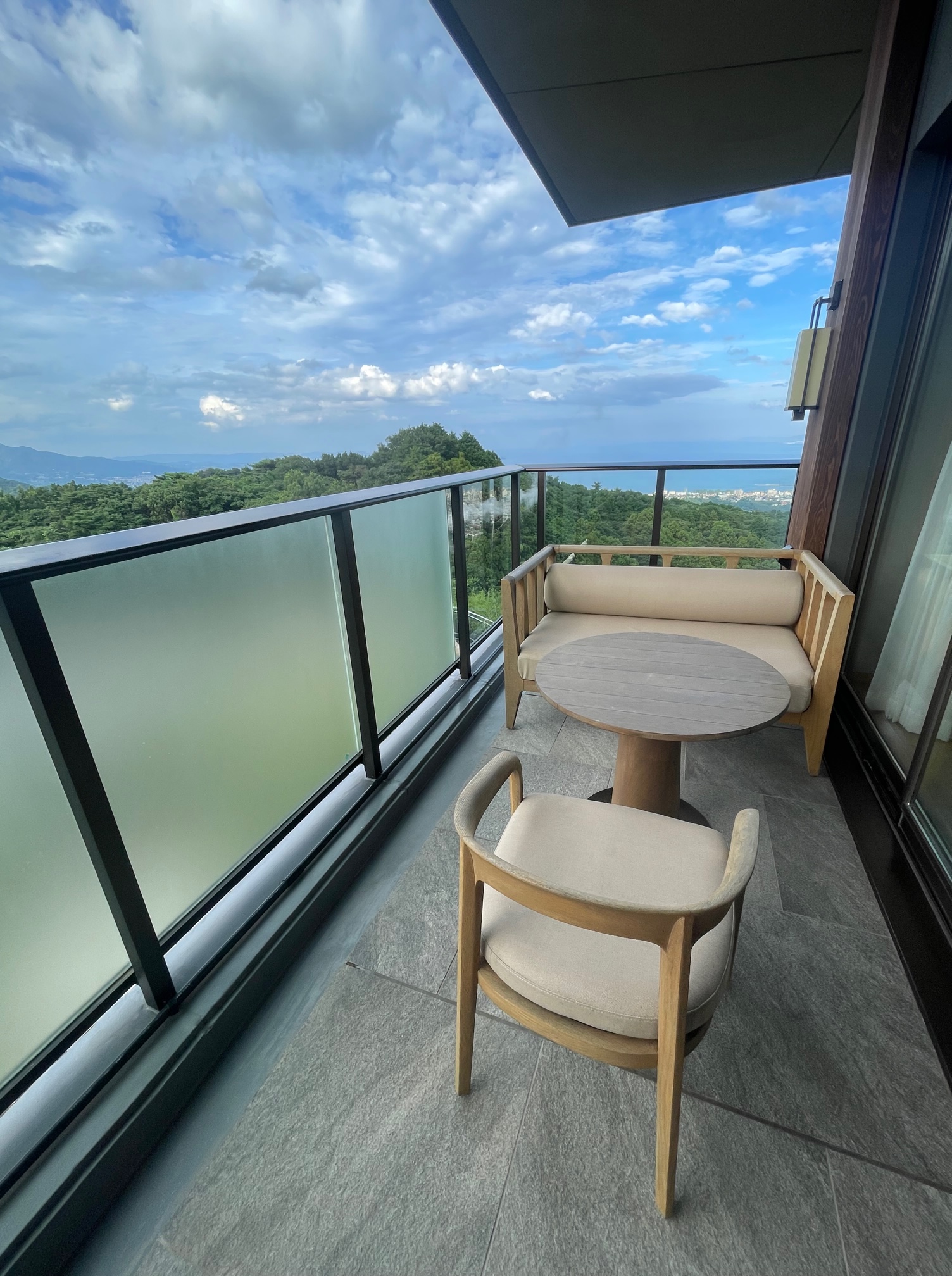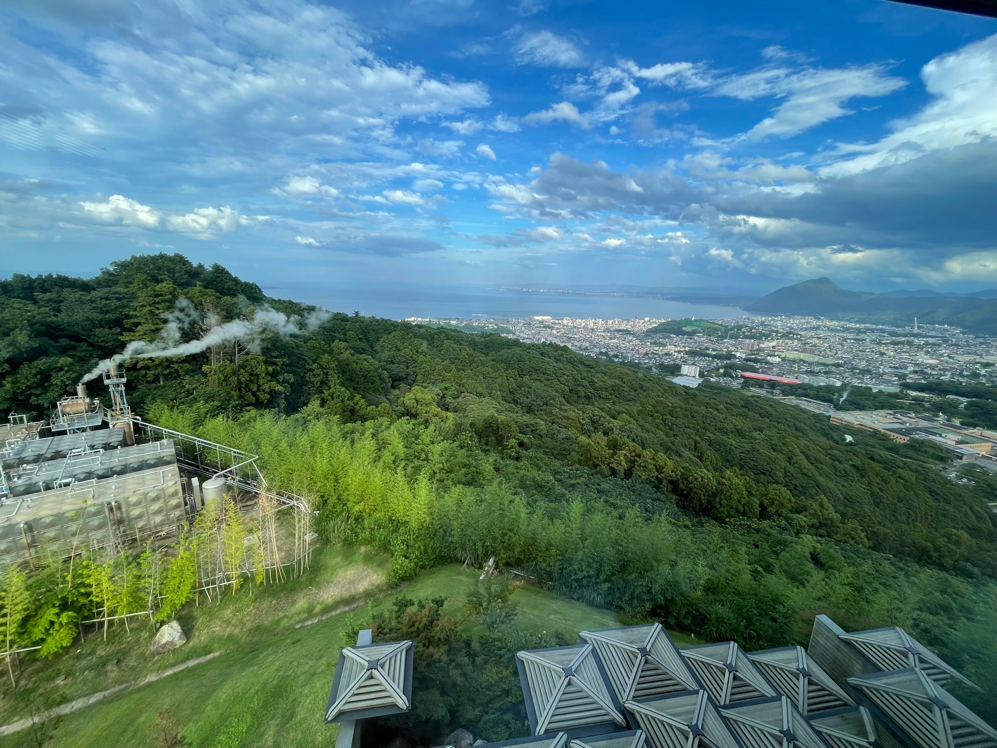 全室テラス付きで別府の山々や温泉郷からの湯けむり、別府湾といった景色を楽しむことができます