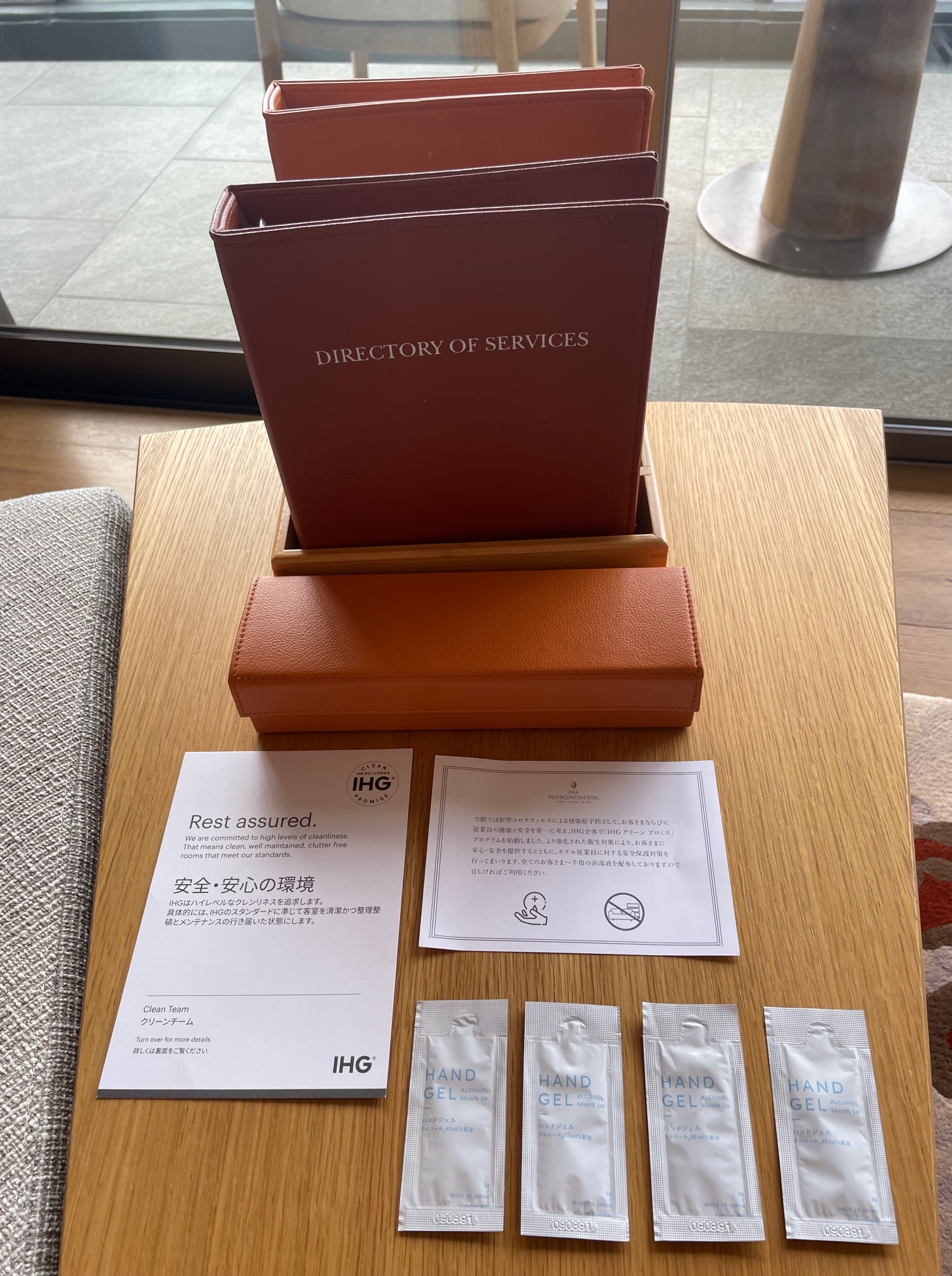 ソファー横のサイドテーブルにはハンドジェル、テレビのリモコンが入ったボックス、ホテルの案内など