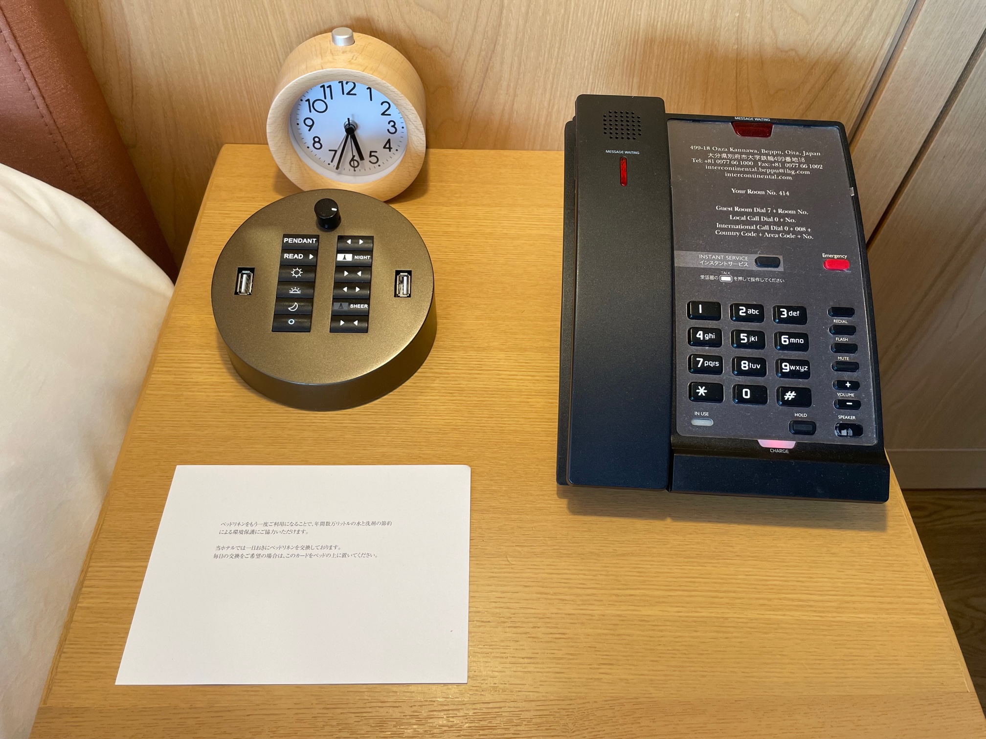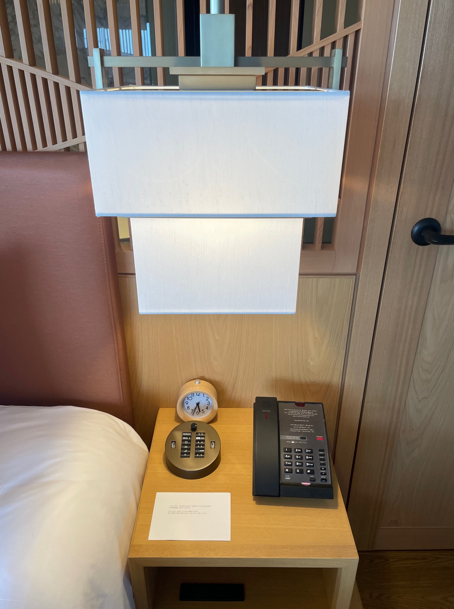 右側のナイトテーブルには電話、目覚まし時計、スイッチ類