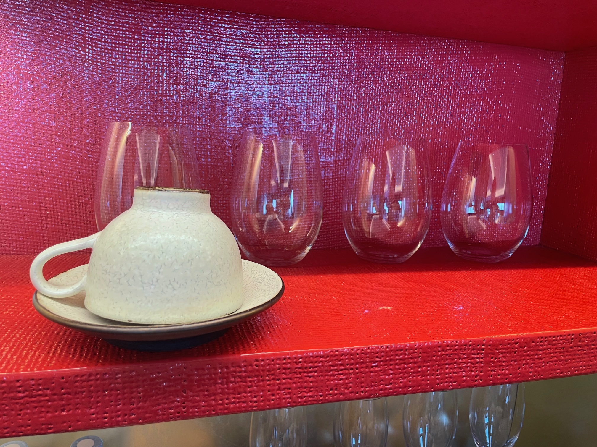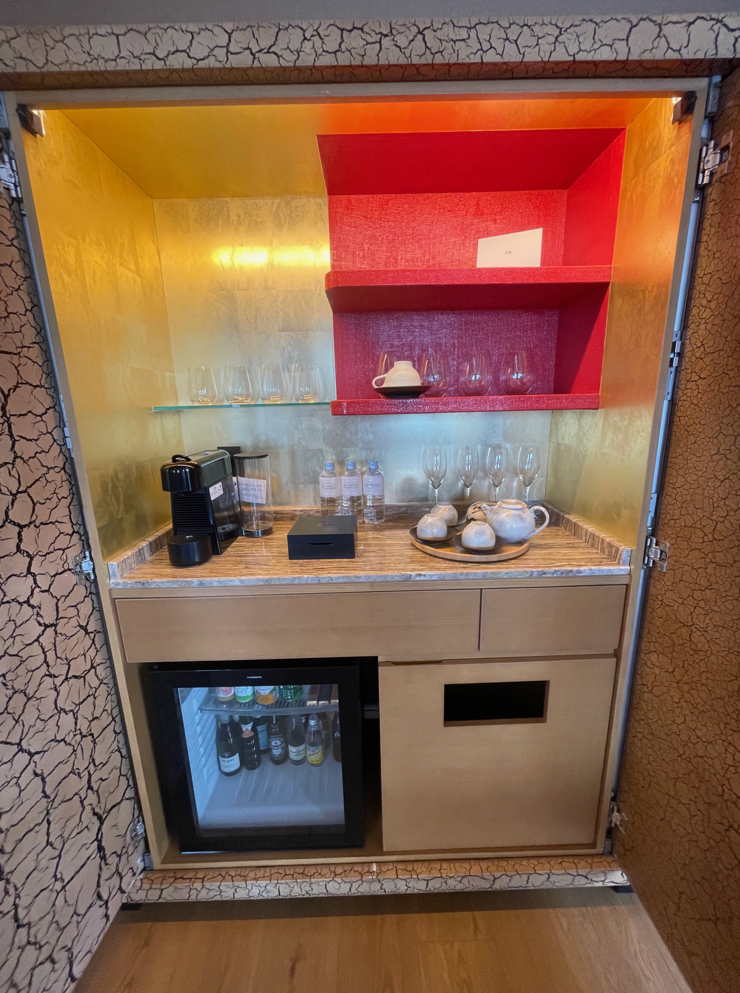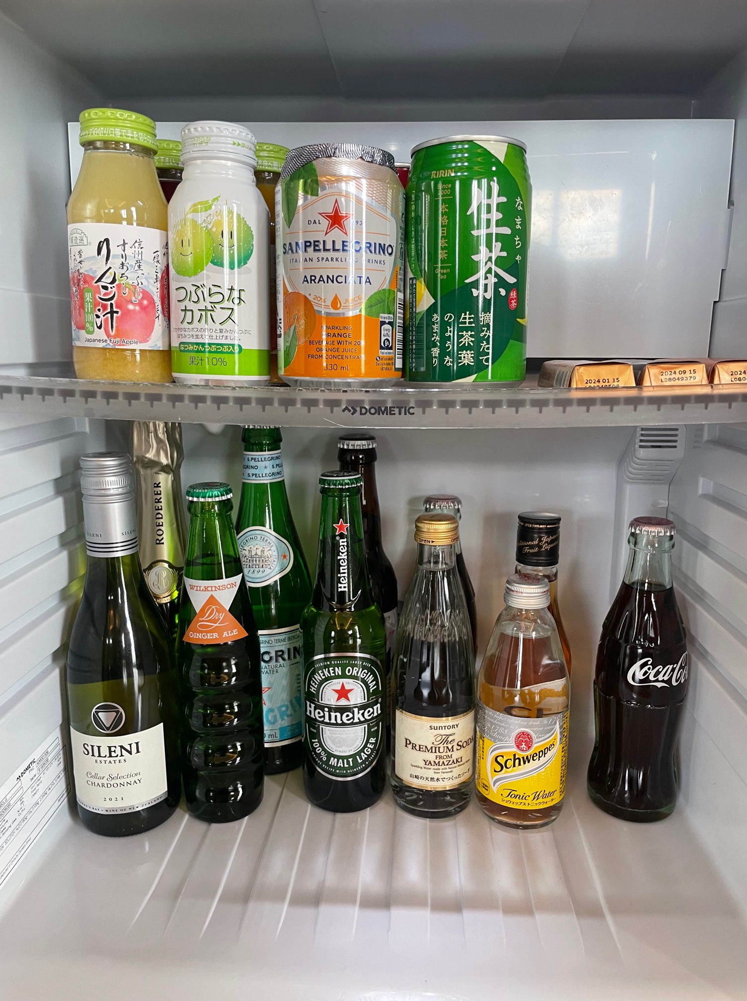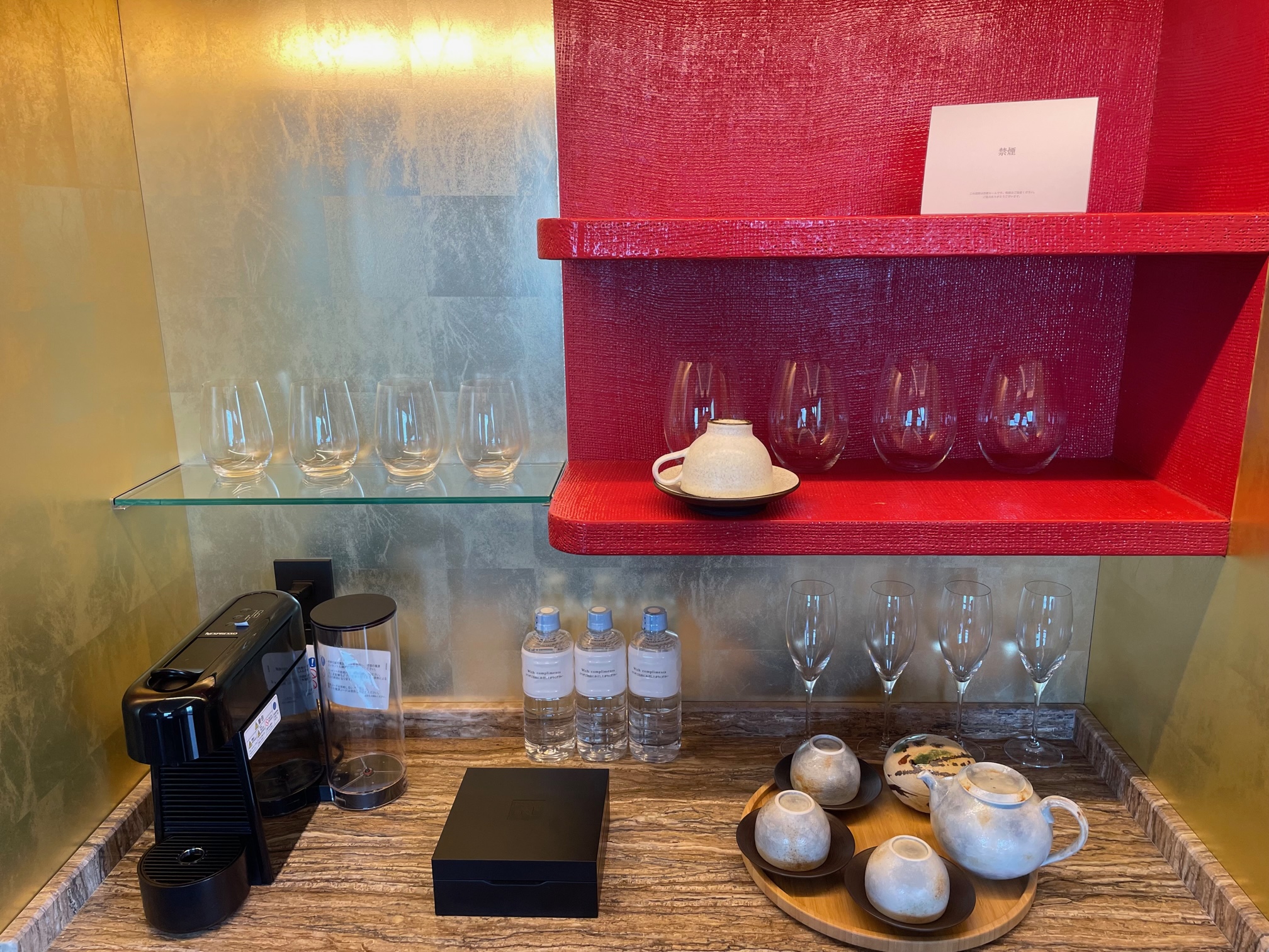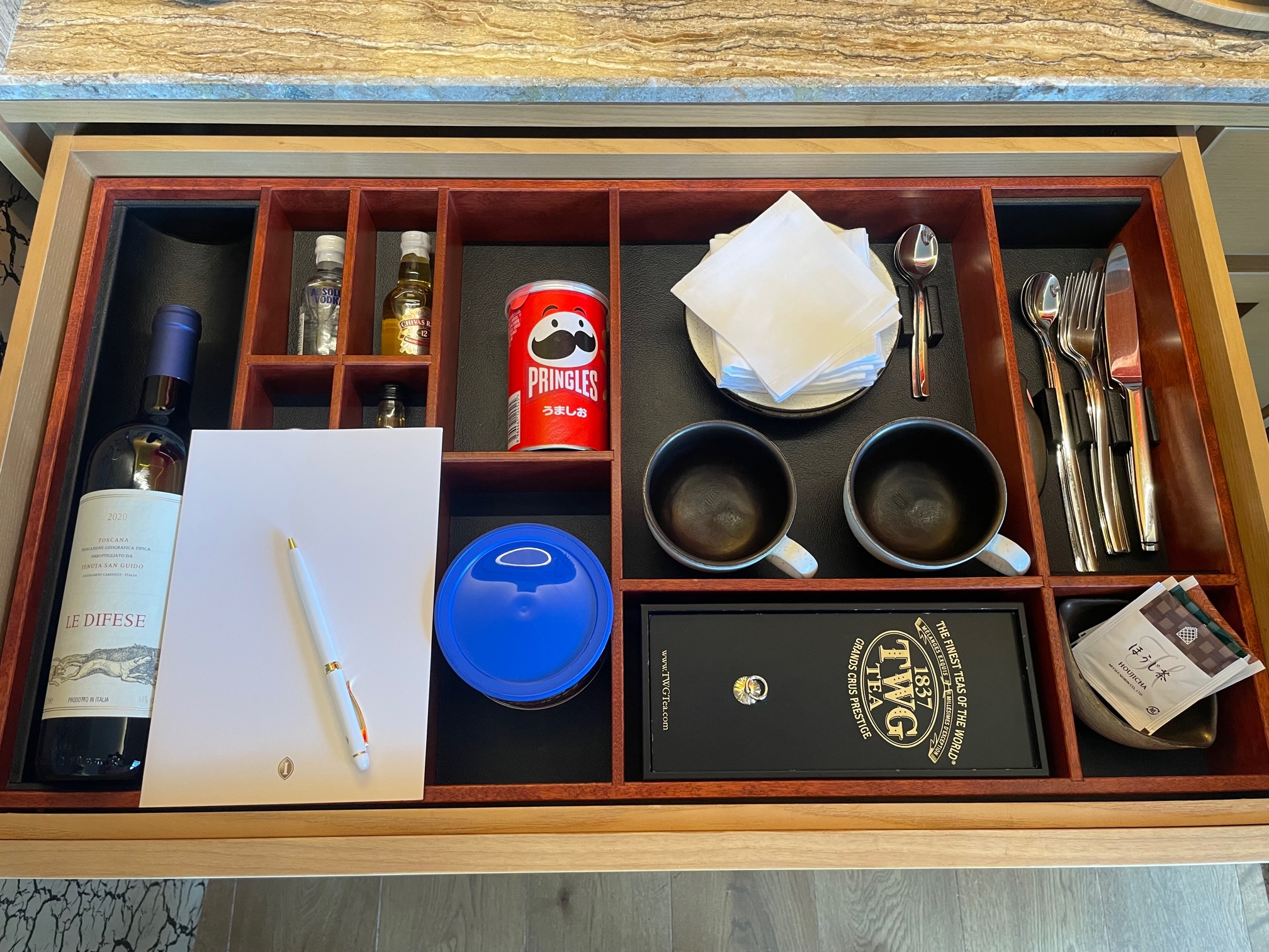 引き出しを開けるとカップ&ソーサ、サービスのお茶やTWGの紅茶、カトラリー、ミニバーのリキュールやワイン、お菓子など