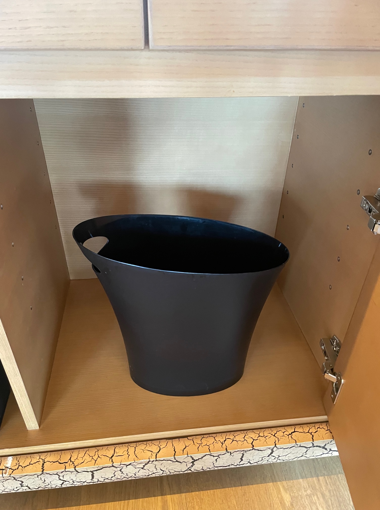 冷蔵庫横の扉を開けるとゴミ箱が!スペースもありますし、開口部にゴミ箱のサイズが合ってない気がしますので、もうちょっと大きなゴミ箱を置いていただきたいところ(笑)