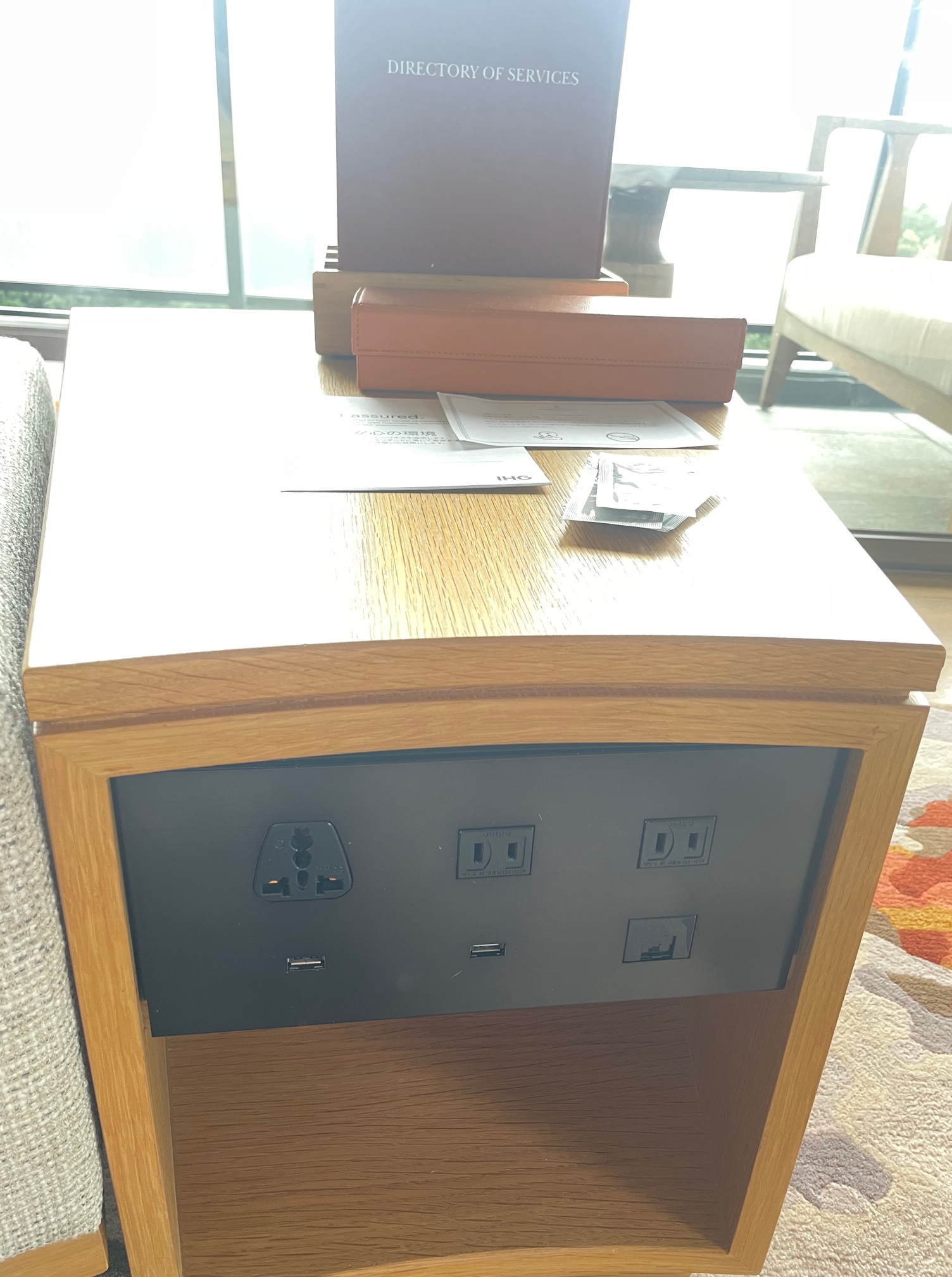 サイドテーブルにコンセントやUSBコンセントがあり便利です