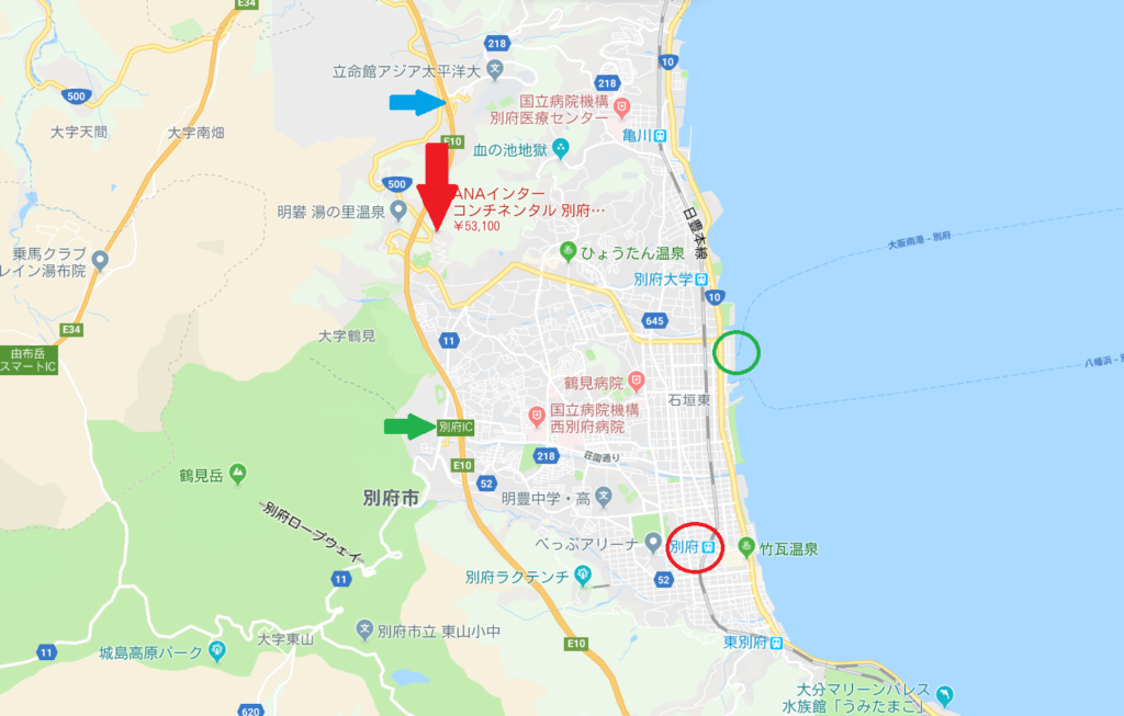 地図で位置関係を整理しましょう。赤矢印が「ANAインターコンチネンタル別府リゾート&スパ」となります。