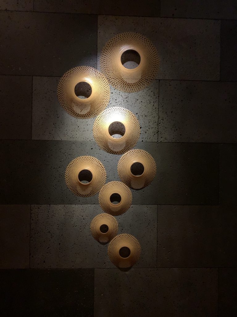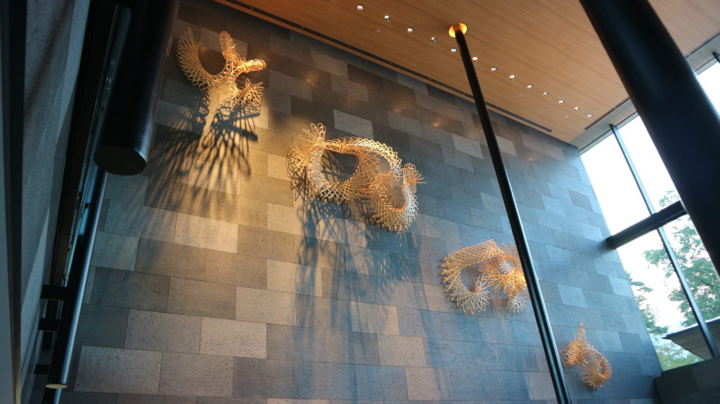エントランスに入ると吹き抜けとなっており別府石の壁と雲をイメージした別府の竹細工が印象的です