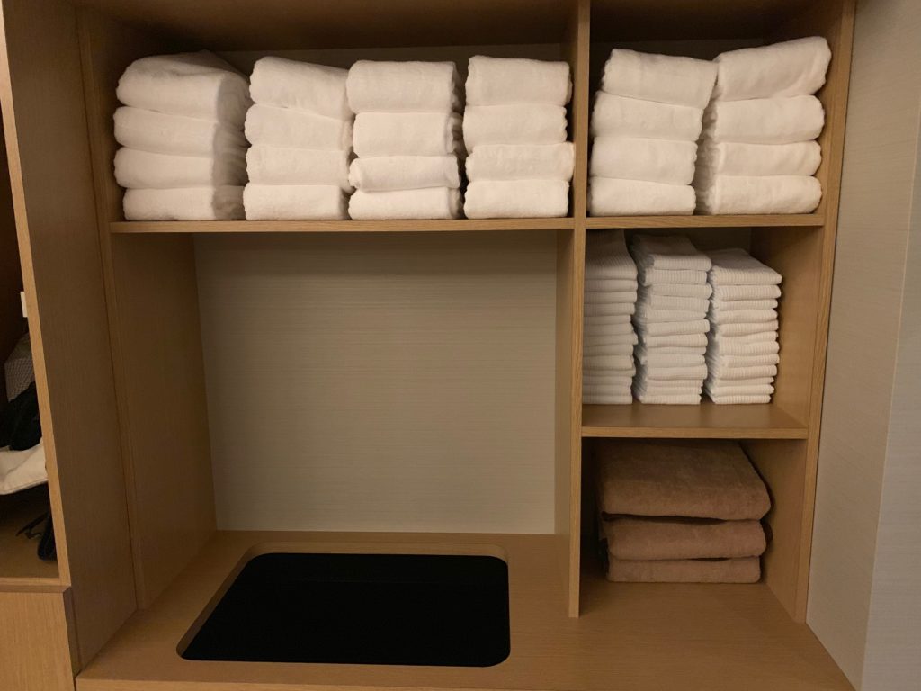 タオルはたくさん用意されており部屋から持参する必要はありません。右下の茶色のものはサウナで敷くものと思われます。