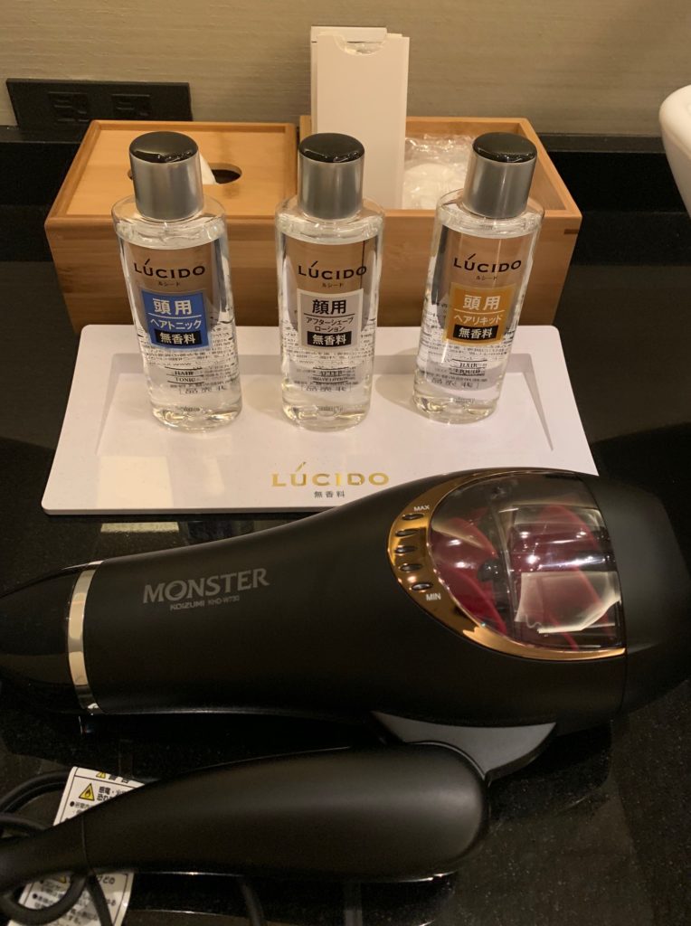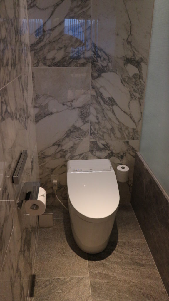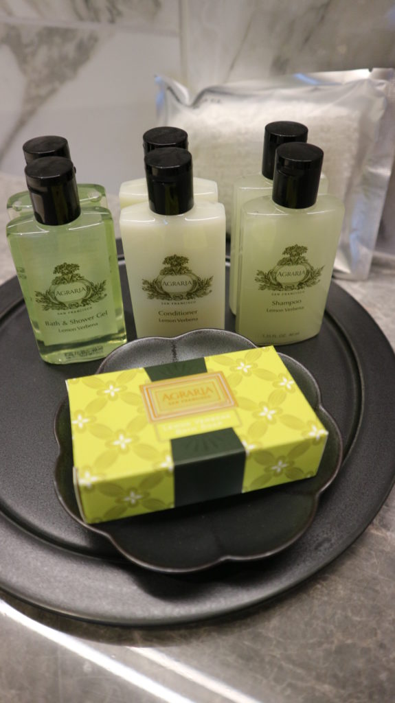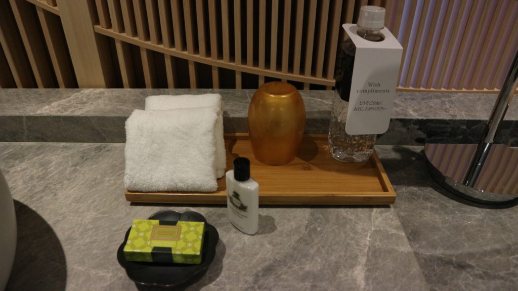 洗面所にもミネラルウォーター、アグラリアのハンド&ボディローションが置かれています。コップは一見プラスチックに見えましたがグラスでした。キレイですね