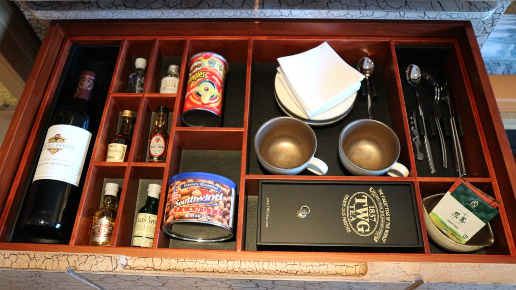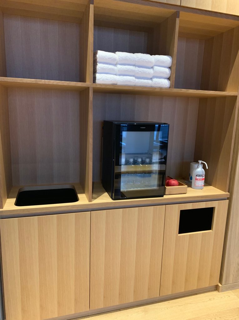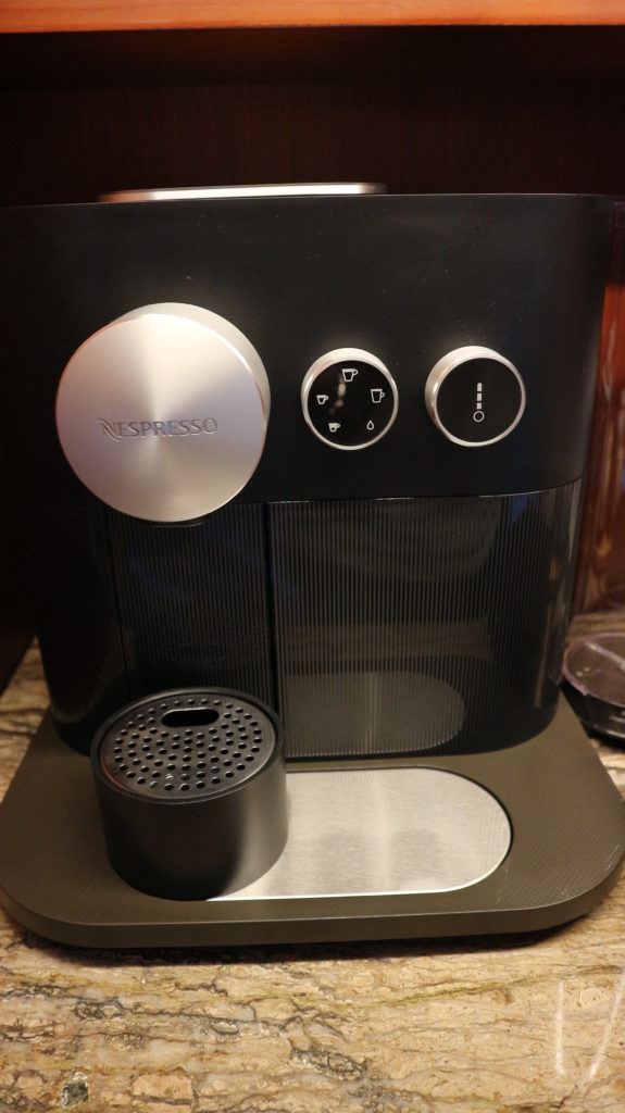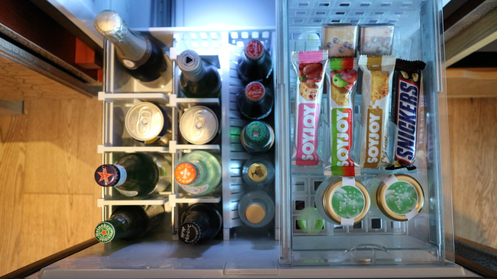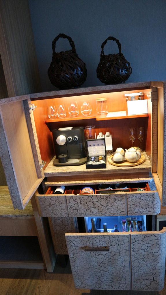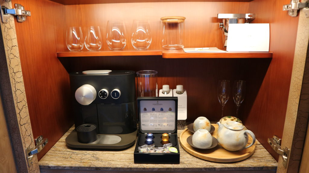 上段の棚にはグラスやコップ、ネスプレッソ、ミネラルウォーターなどが置かれています。ネスプレッソ、ミネラルウォーターは無料です