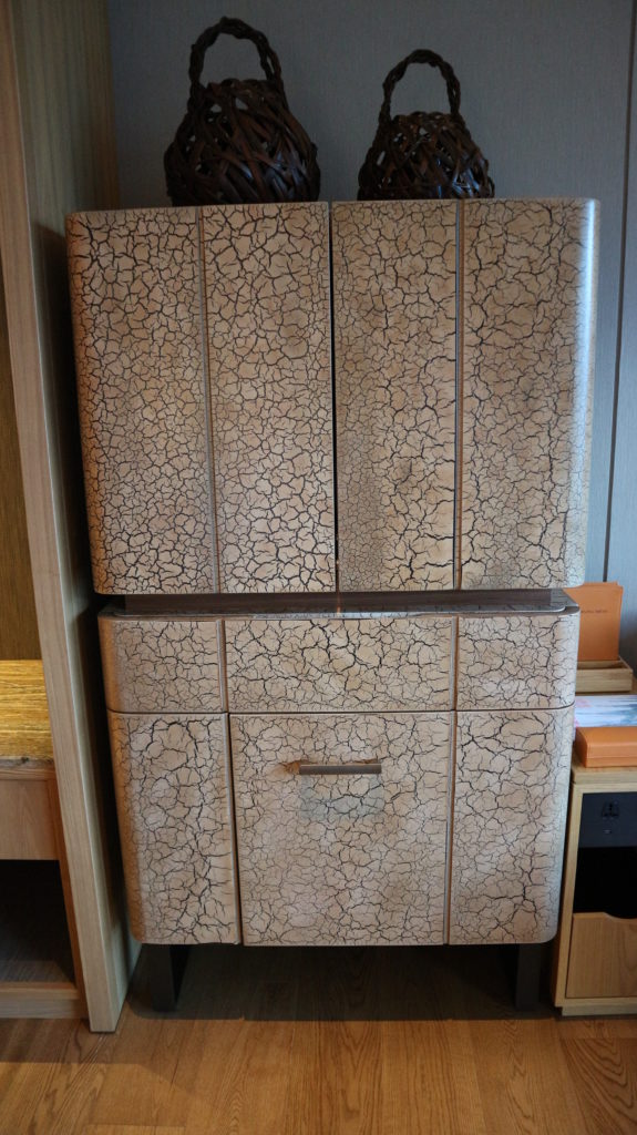 さらに隣にはとっても目立つキャビネットが鎮座しています。上には竹細工のインテリアが置かれています