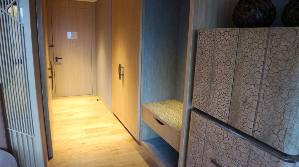 左手の扉はクローゼットとなっており、その横にラゲッジスペース、さらに隣にはミニバーや冷蔵庫が収納されたキャビネットがあります。室内から入り口を振り返ってみるとこのような感じです。