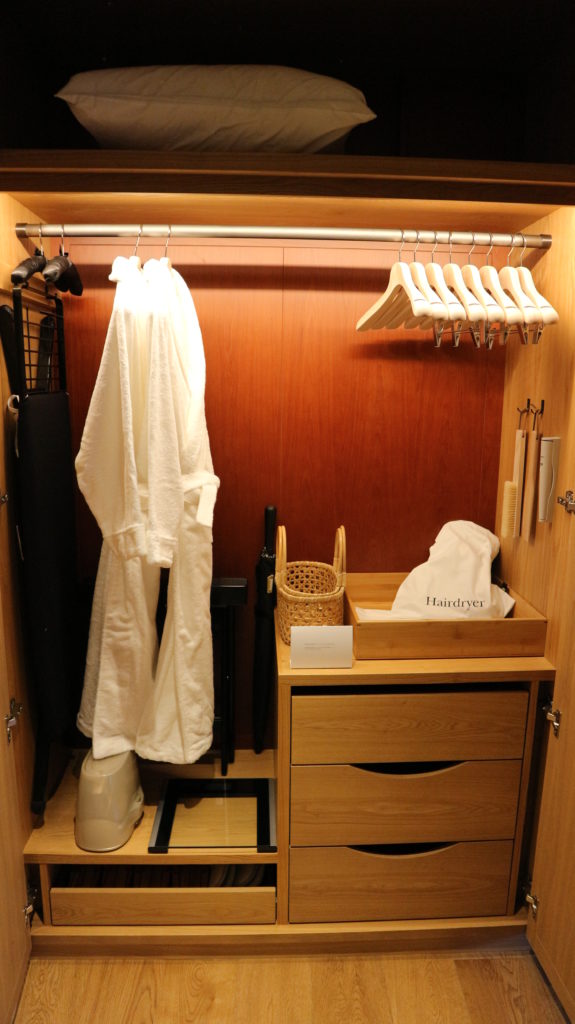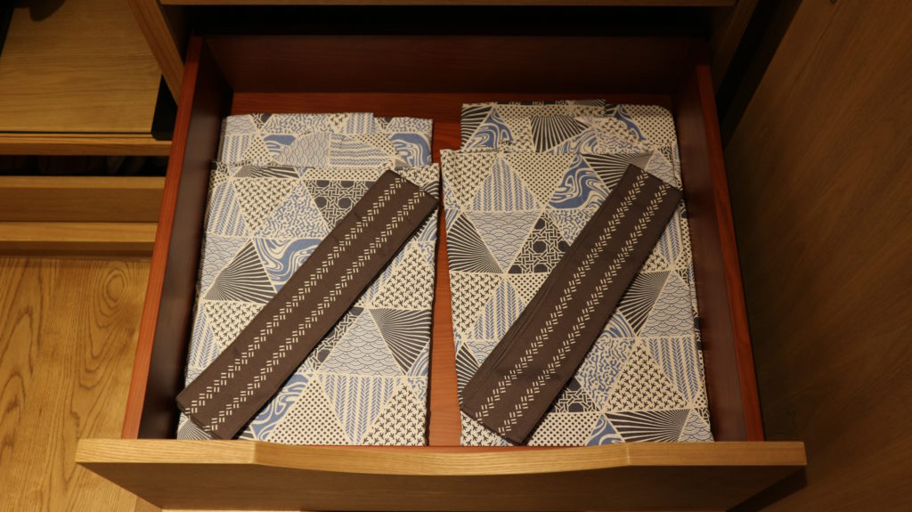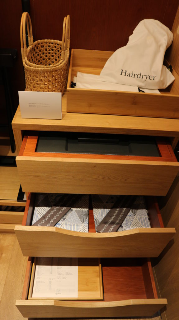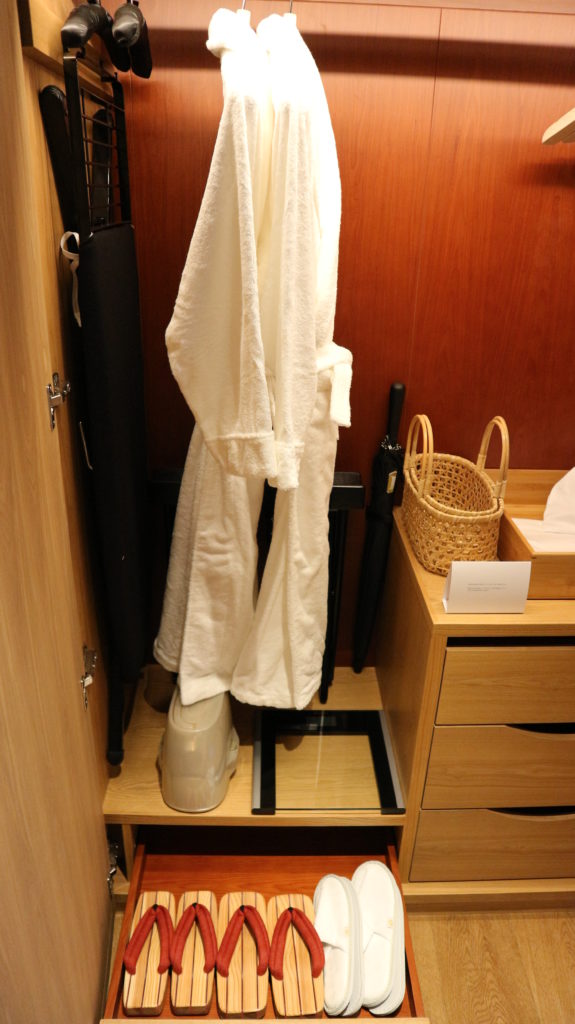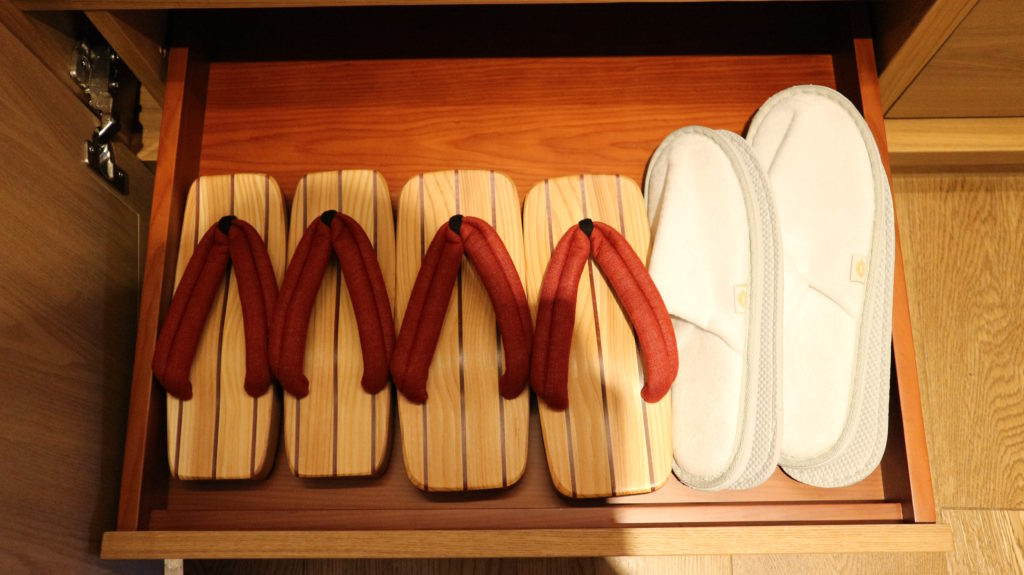 左下の引き出しを開けるとスリッパや下駄が入っています。外資系ながら温泉地別府らしいですね。