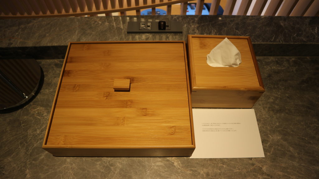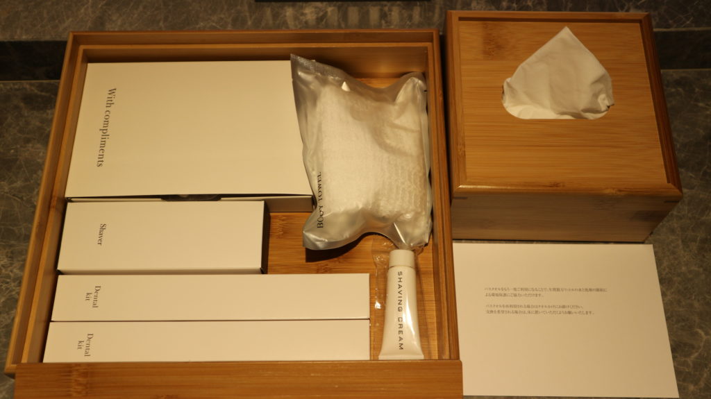 ティッシュの横の箱を開けると歯ブラシやカミソリなどのアメニティが入っています
