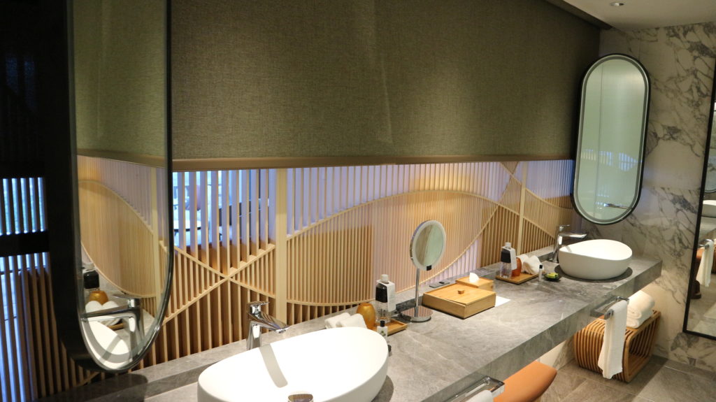 ダブルボウルの洗面所はとても広いです。木の格子越しに別府の山々や湯けむりが見えます