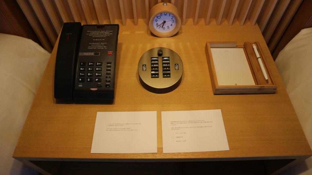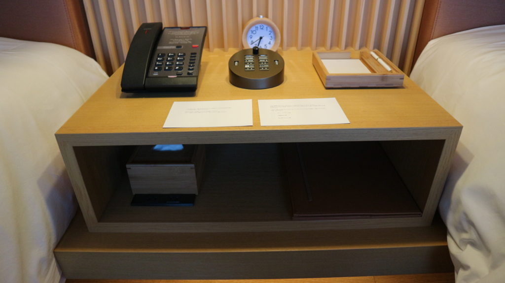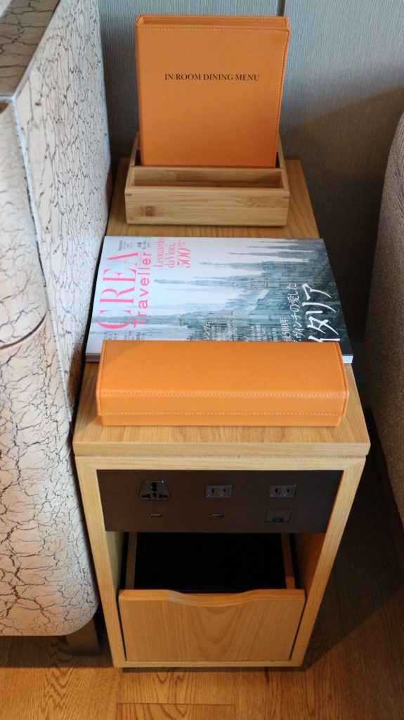 キャビネットの隣にはサイドテーブルがあります。ルームサービスのメニューとテレビリモコン(オレンジの箱の中)、雑誌が置かれています。