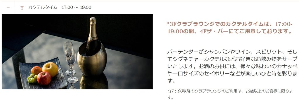 イブニングカクテルタイムは12歳以下の子供は利用できません。12歳以下の子連れの宿泊客は代替措置として、4階エレメンツで前菜ビュッフェとクラブインターコンチネンタルラウンジと同じドリンクメニューを楽しむ事が可能です。ただし、エレメンツでの代替サービスは18:00-20:00となり、提供時間が異なることに注意が必要です。