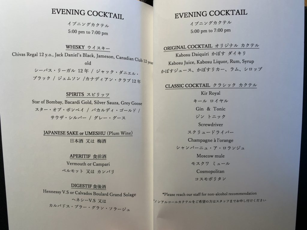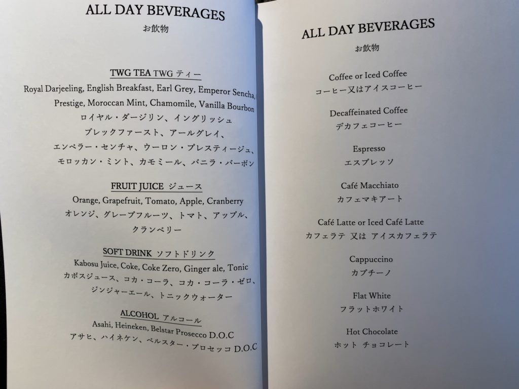 ラウンジがオープンしている間いつでも注文できる飲み物のメニューとなります。