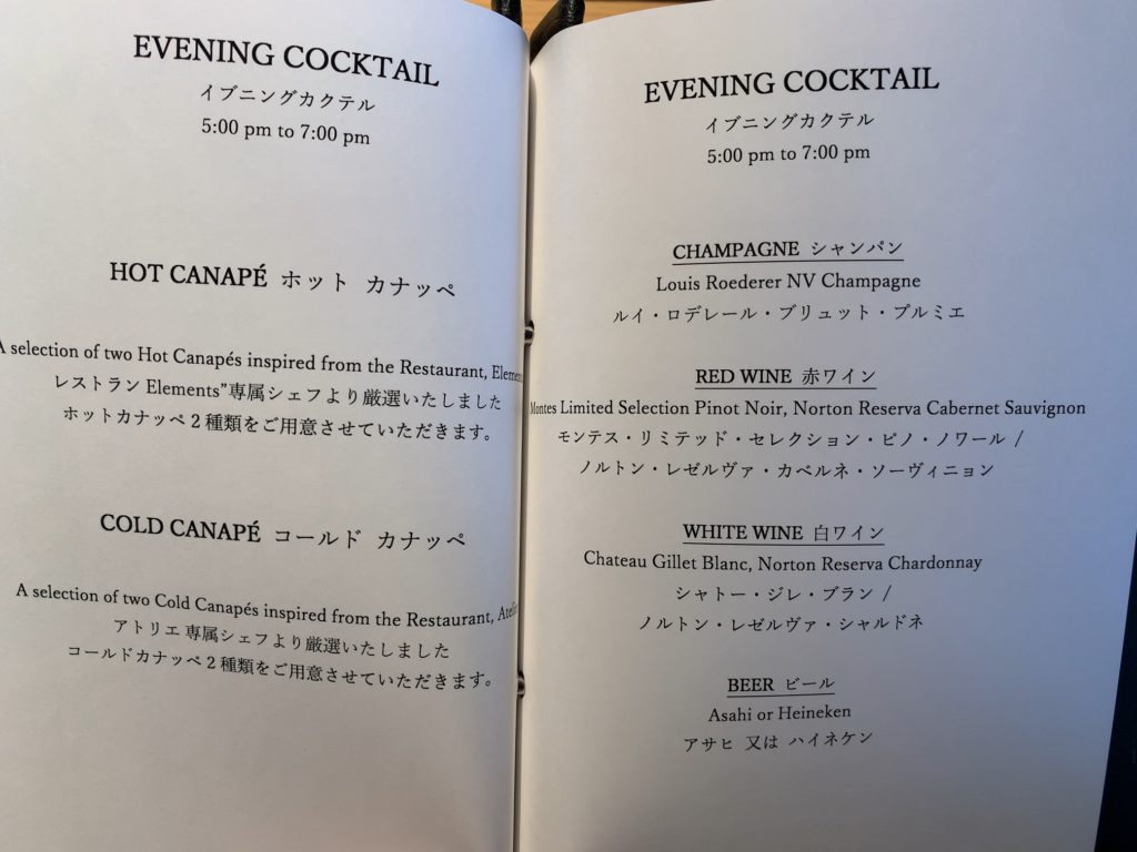 しかし、今回エレメンツで前菜ブッフェが行われていた日もありましたが、通常通りカナッペの提供とラウンジと同等のドリンクメニューのサービスとなっており、前菜ブッフェについての説明はありませんでした。新型コロナ対応の間だけなのかサービスが変更になったのかは不明です。