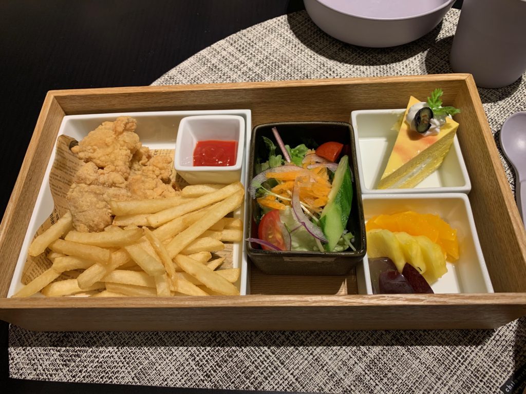 子供にはから揚げ、フライドポテト、ミニサラダ、デザートの盛り合わせが提供されます。