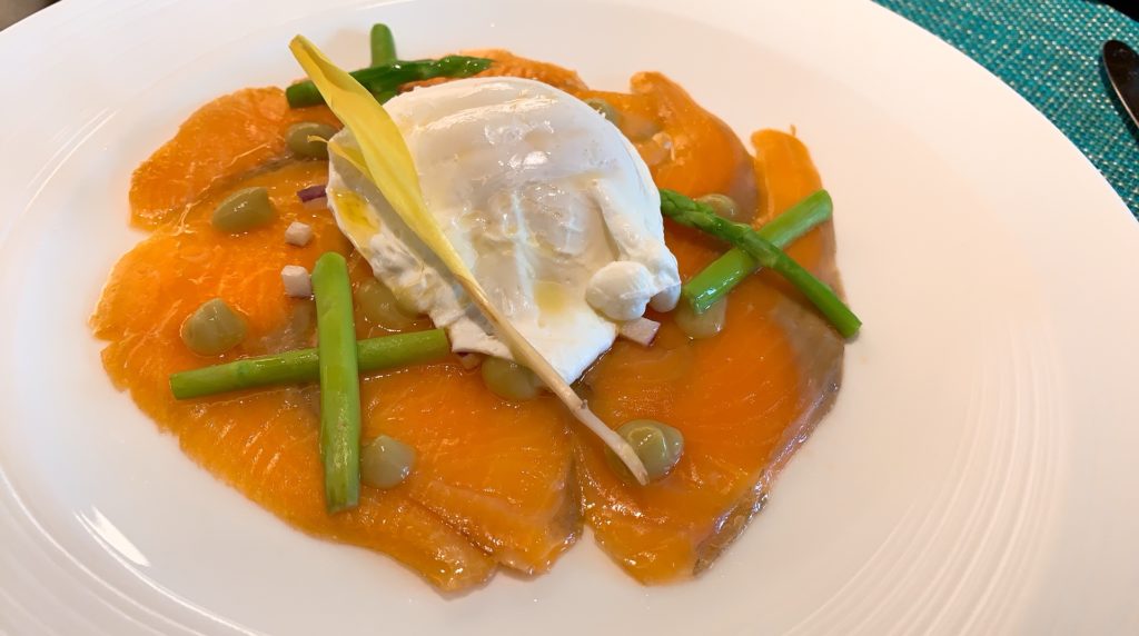 スモークサーモンカルパッチョ、ポーチドエッグ、アボカドとアスパラガス
