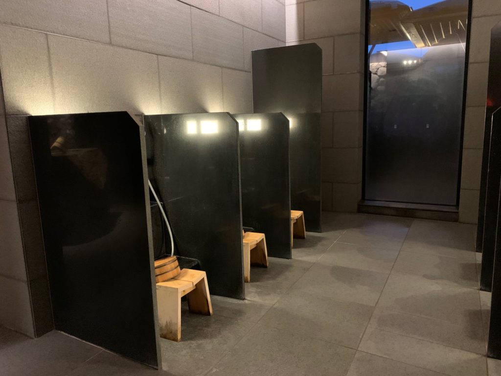 洗い場はこんな感じです。木の椅子と木桶が温泉らしい雰囲気です