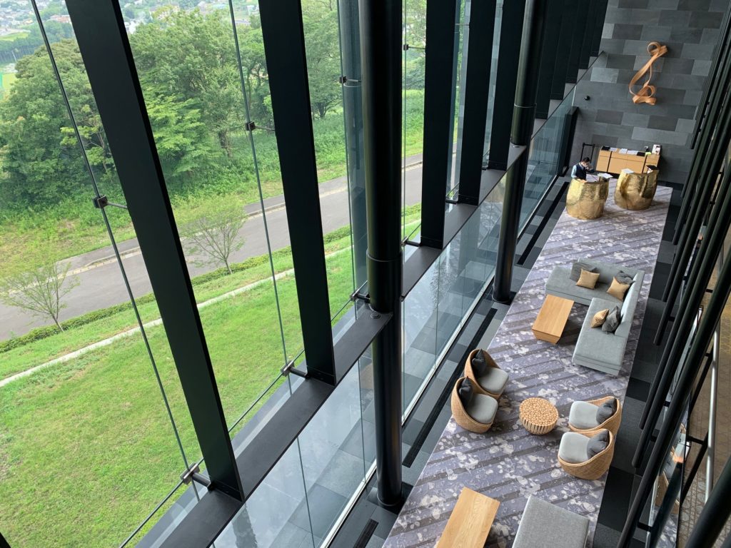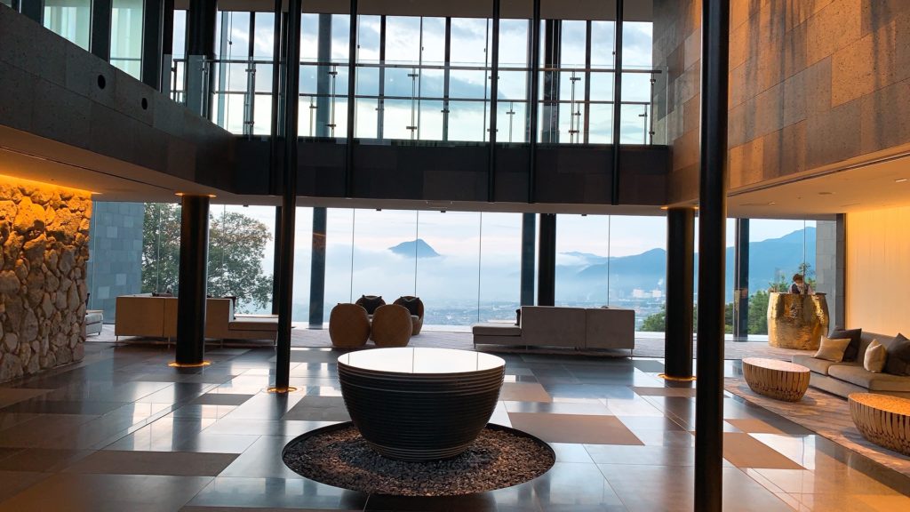 高い吹き抜け、別府市内を見渡す大きな窓が印象的なロビーです。