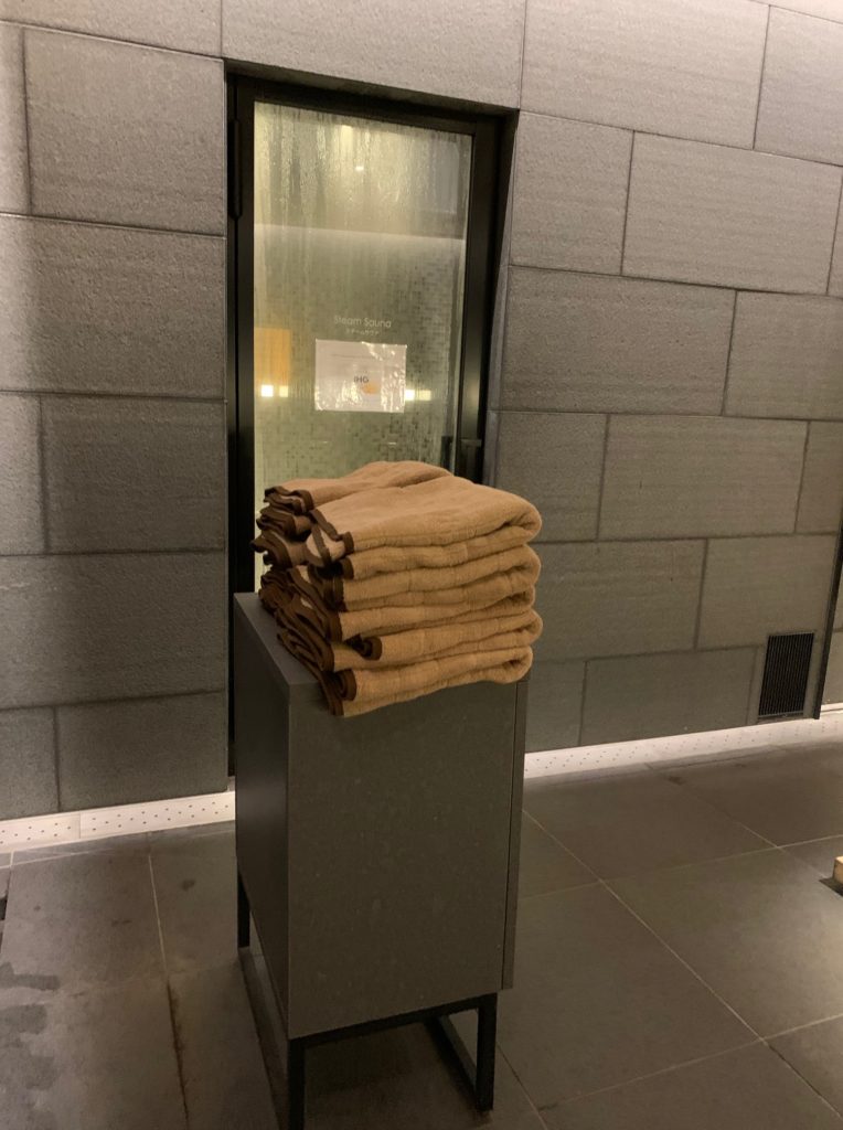 タオルはたくさん用意されており部屋から持参する必要はありません。右下の茶色のものはサウナで敷くものと思われます。