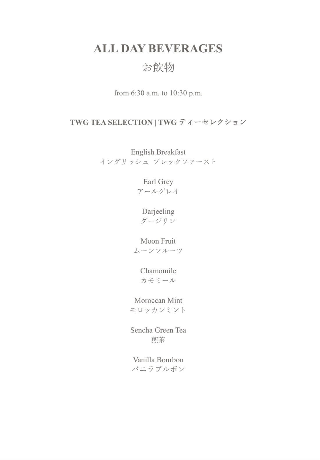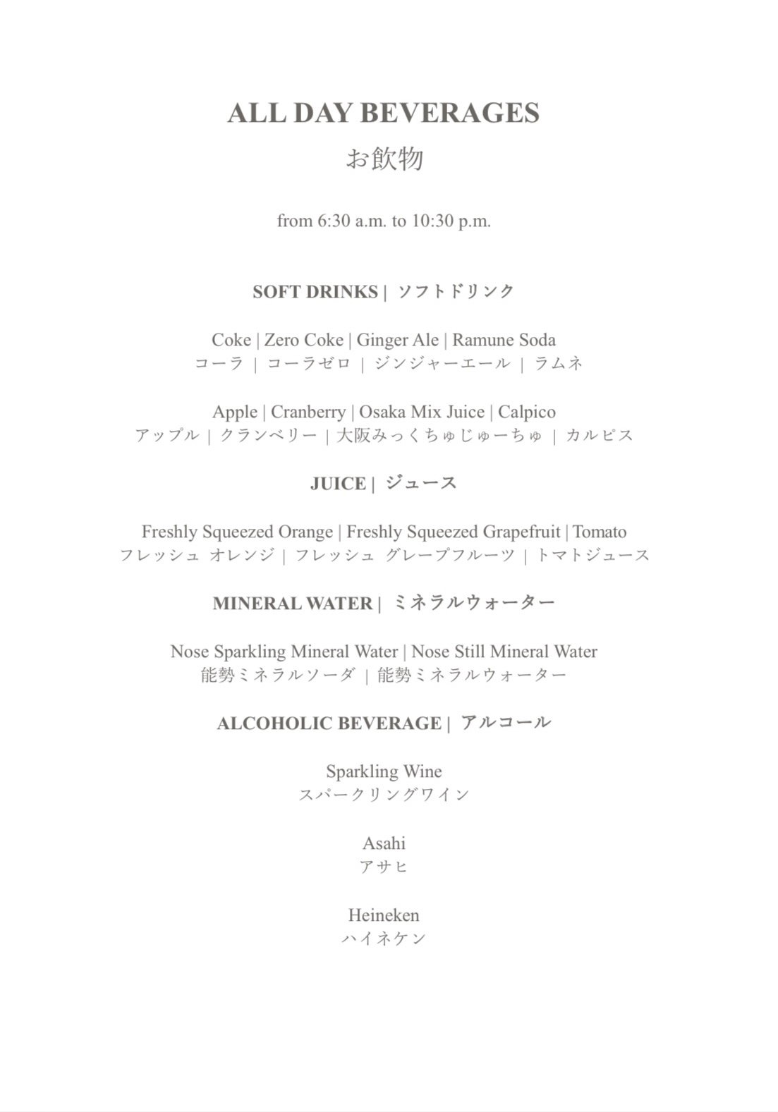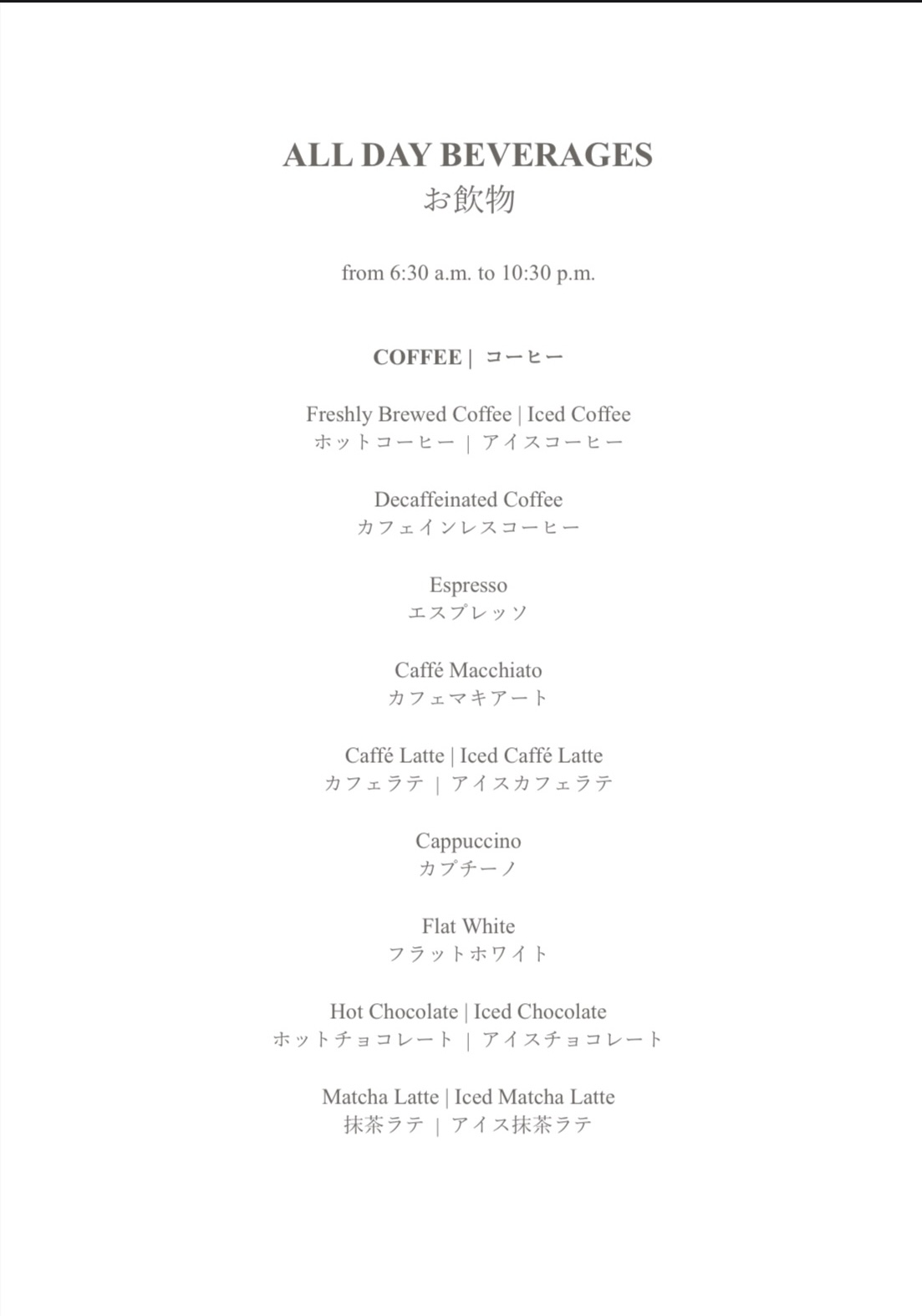 クラブラウンジがオープンしている時間全てで注文できる飲み物をご紹介します。カクテルタイムは注文できる飲み物が増えますので後ほどご紹介します。