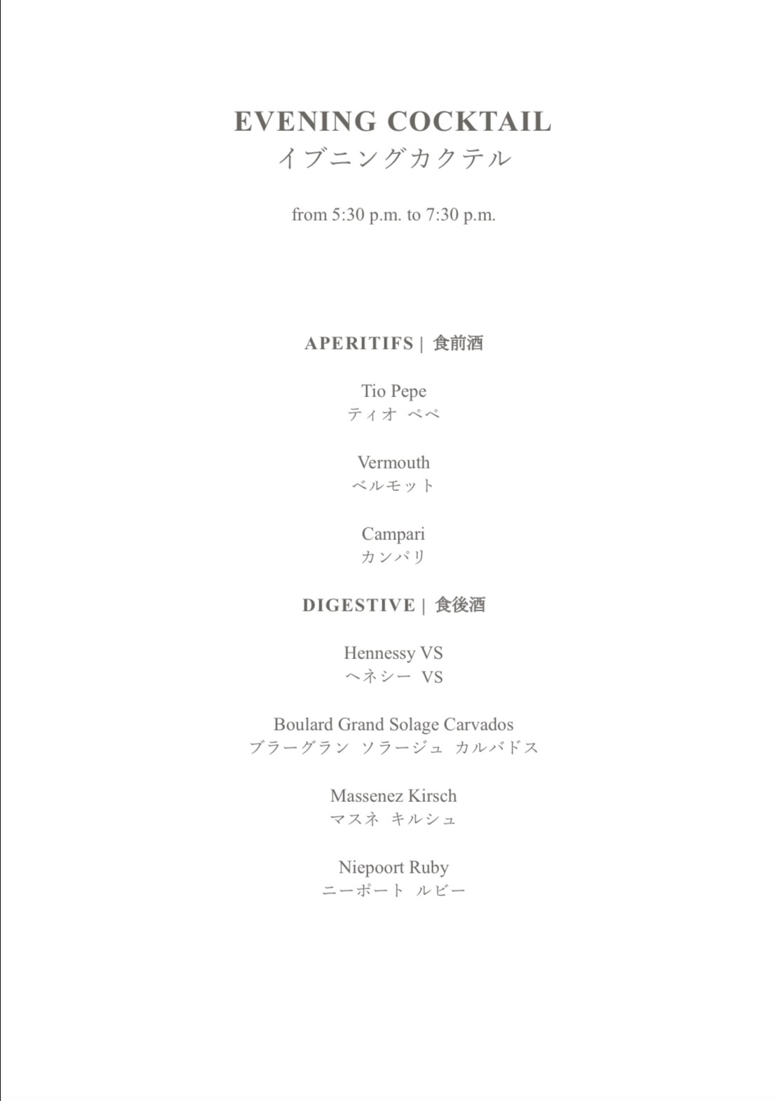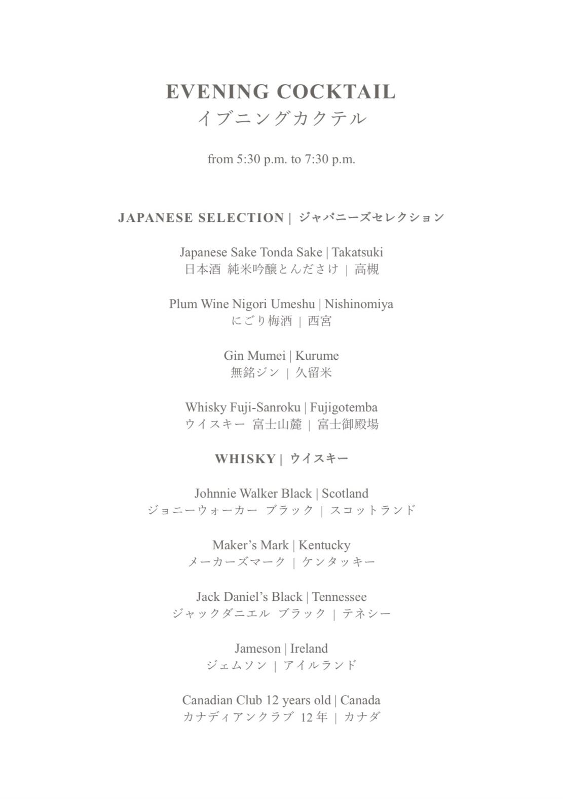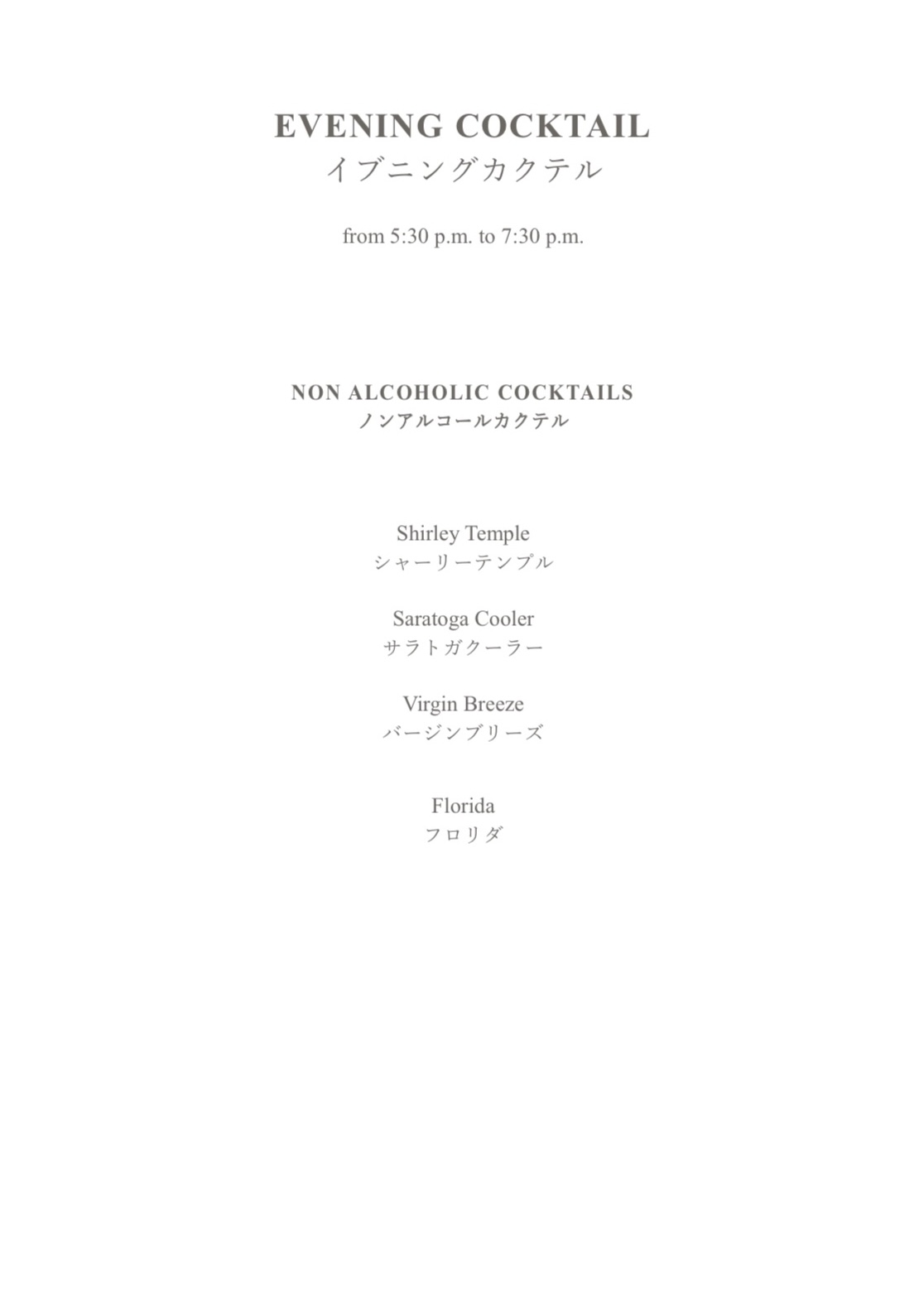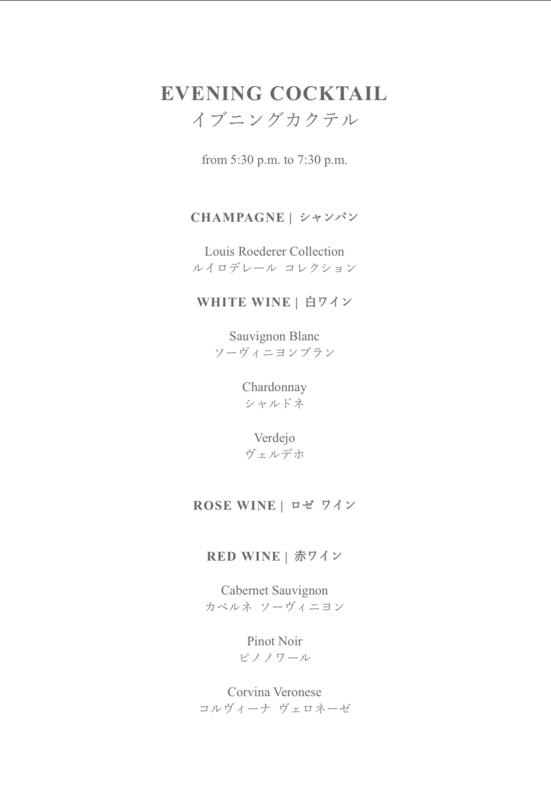 さてイブニングカクテルのドリンクのメニューをみていきましょう