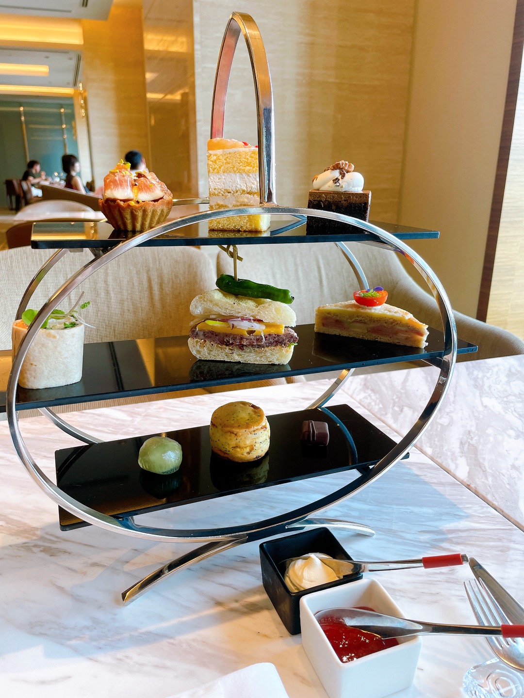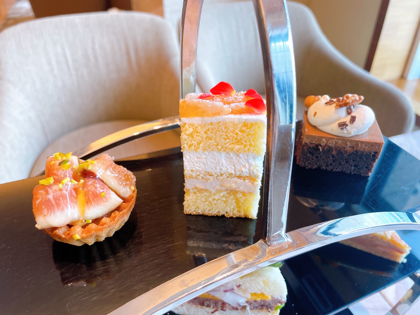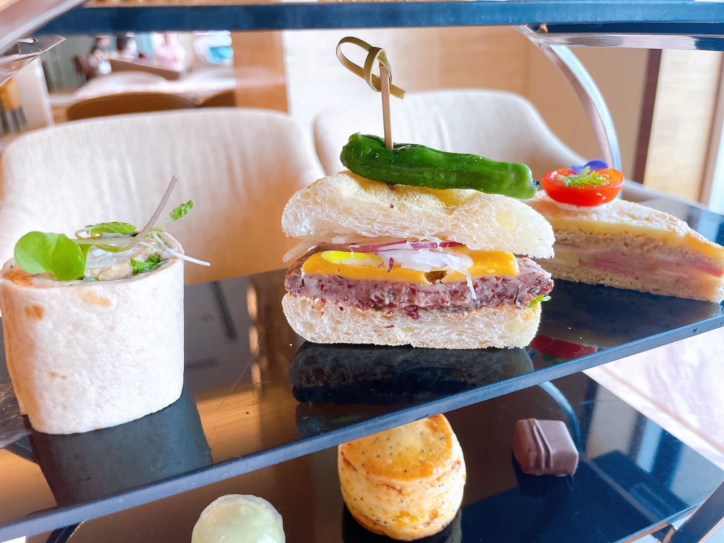 アフタヌーンティーの時間帯では3段トレイでサンドイッチやスコーン、スイーツが提供されます。