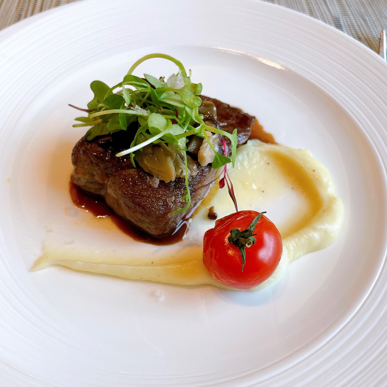 US産牛&クリーミーポテト、マッシュルーム、トリュフと赤ワインソース