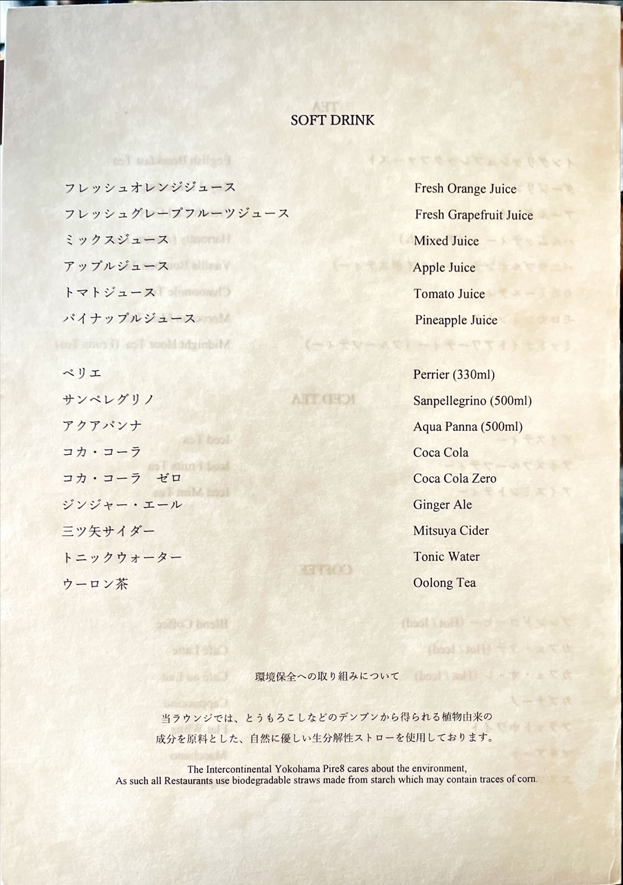 それではインターコンチネンタル横浜Pier8 クラブインターコンチネンタルラウンジで提供されているメニューをご紹介します。