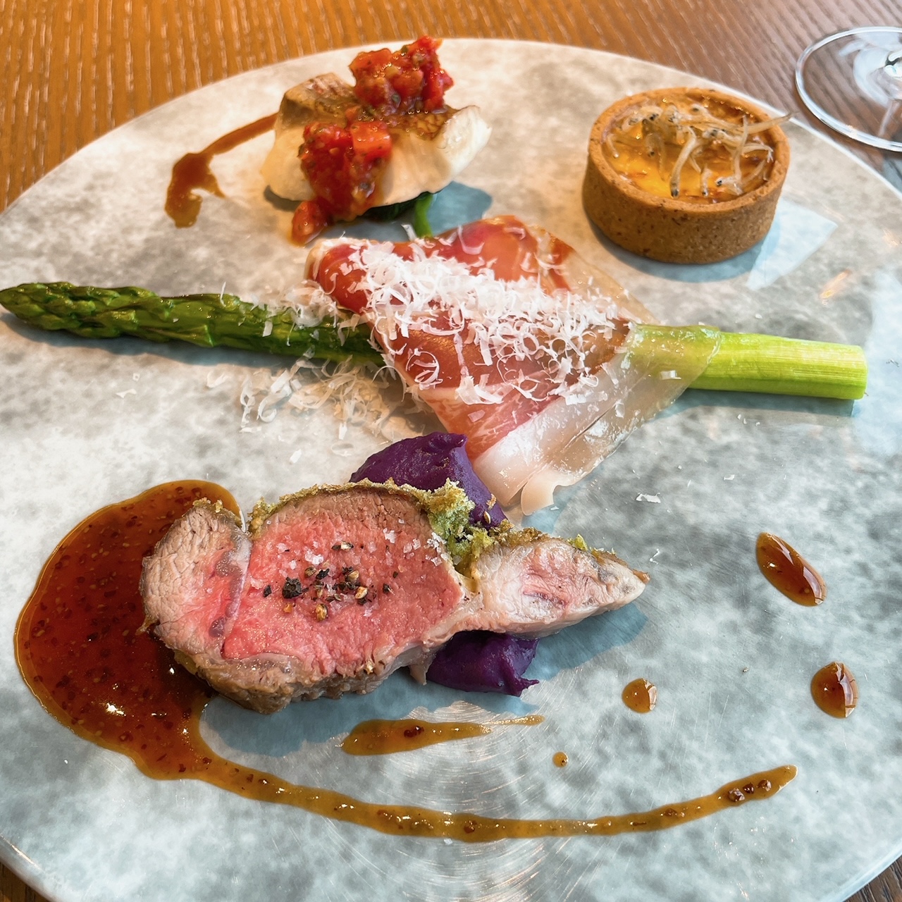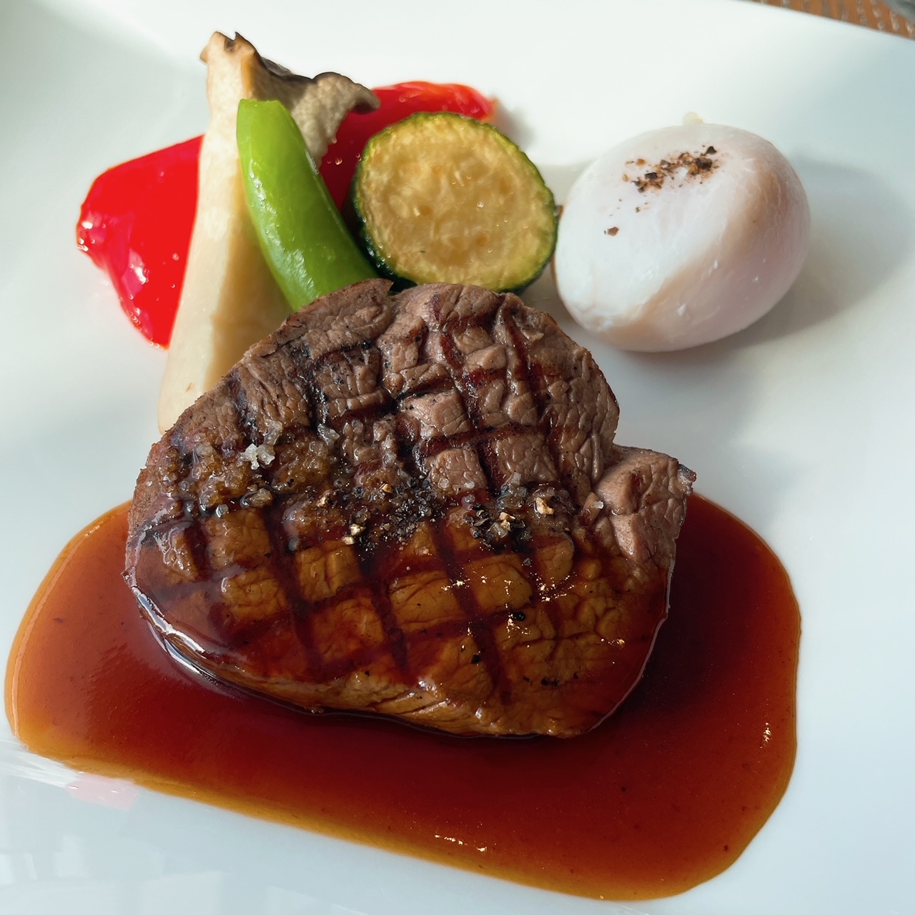 牛フィレ肉のステーキ ポーチドエッグ添え マデラソース