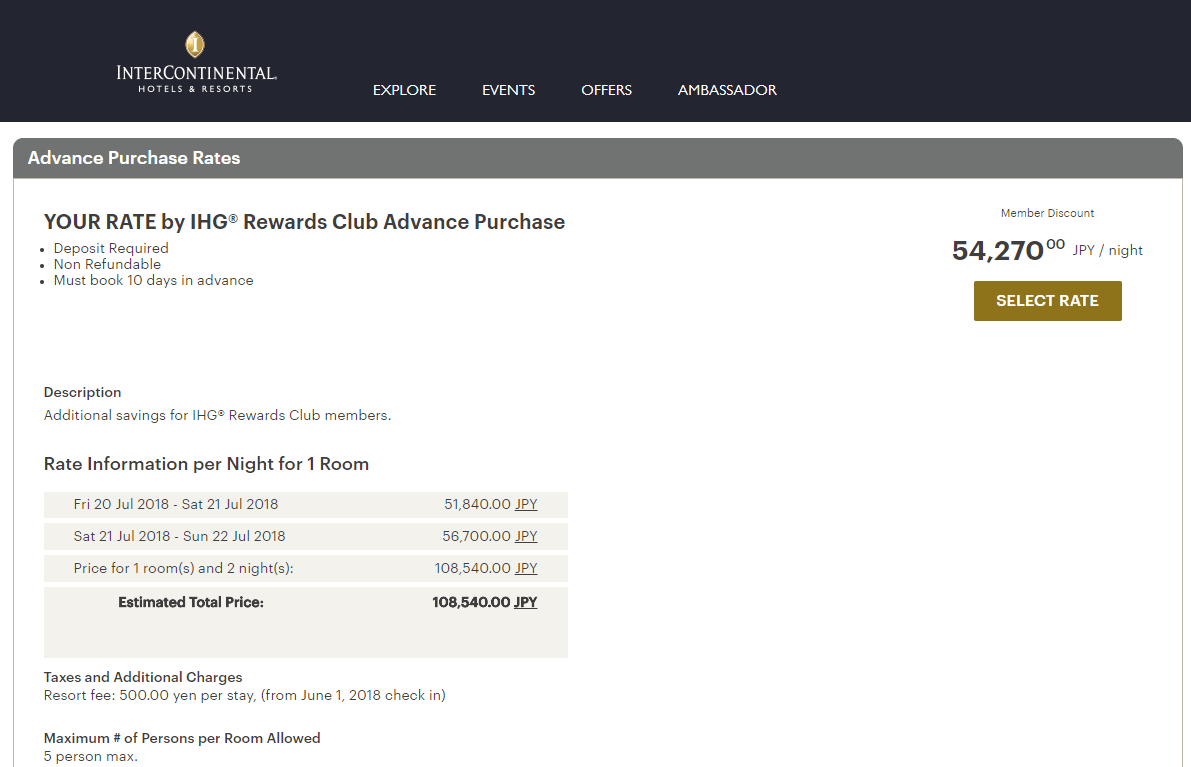 ちなみに青枠で囲っている最安値の「YOUR RATE by IHG® Rewards Club Advance Purchase」の料金の詳細を見てみましょう!