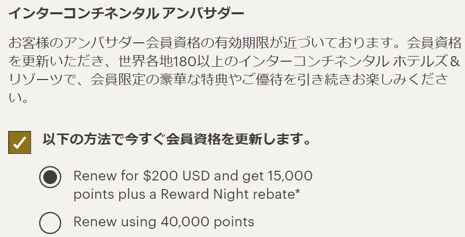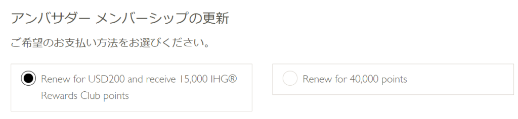 入会金は200ドル(約22000円)IHGリワーズクラブのポイントで入会、継続も可能であり、入会時に200ドルの代わりに40000ポイント、更新時に150ドルの代わりに40000ポイントで支払うことも可能です。