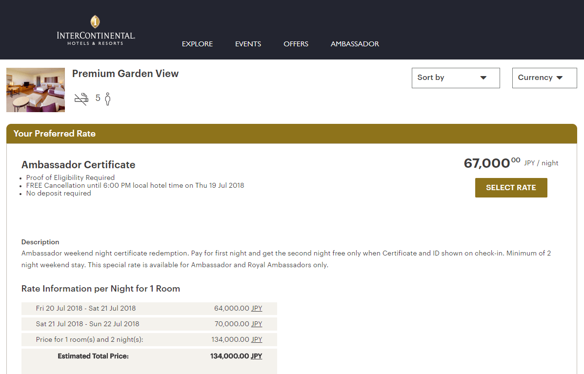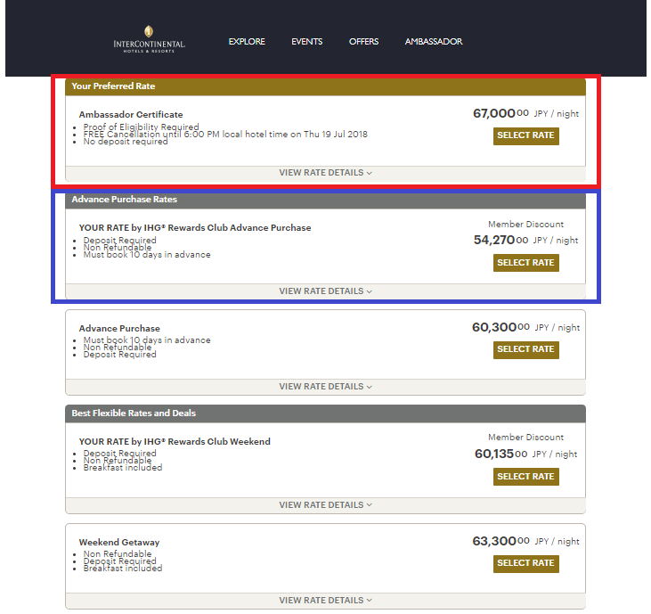 ウィークエンド無料宿泊券を使用できるのは一番上の赤枠で囲んだ「Ambassador Certificate」になります。ちなみにこの料金と同等なのは下の方の赤枠で囲った「Best Flexible Rate」になります。ウィークエンド無料宿泊券のレートは高いと言ってもキャンセル可能な料金の最安値より5%高い程度ですね。