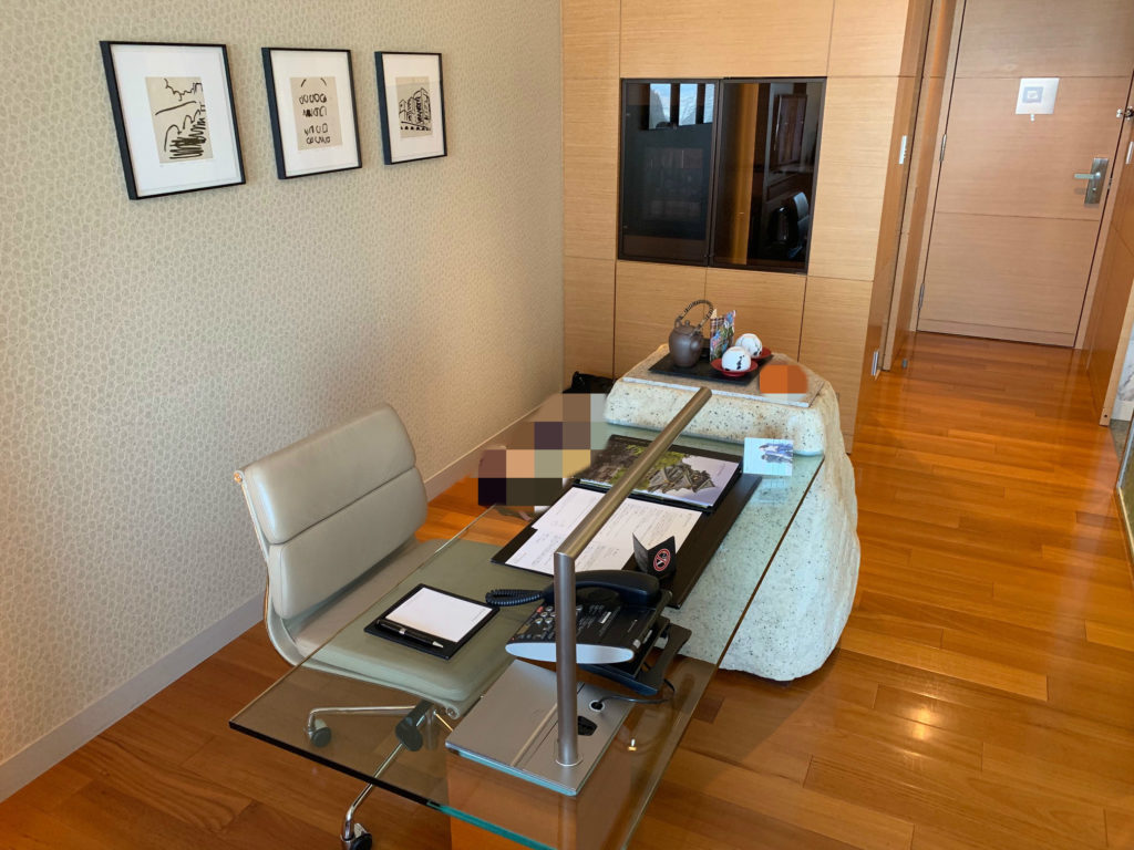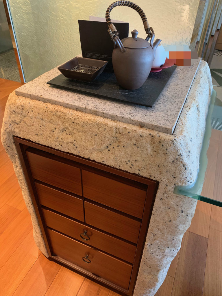 ソファー側から見るとこのような感じです。インターコンチネンタルホテル大阪の客室は何と言っても石のキャビネット?テーブル?が印象的です