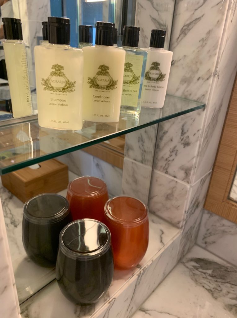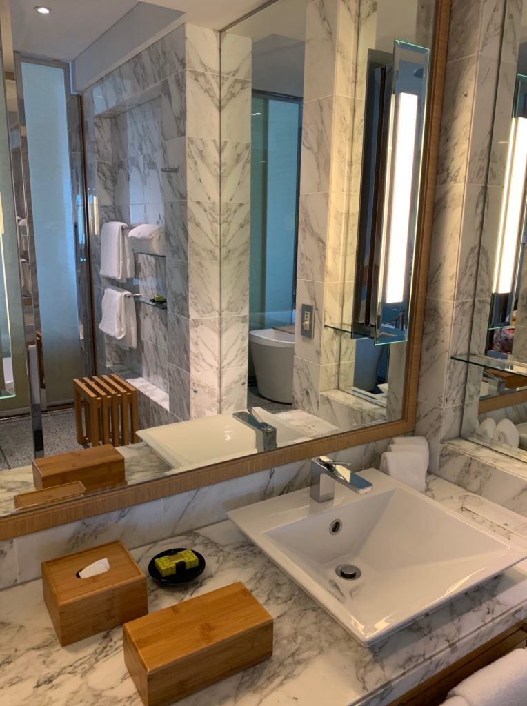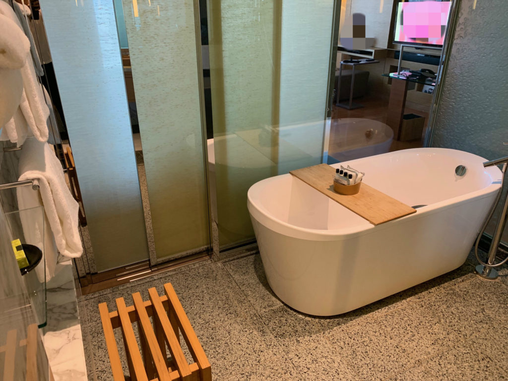 お風呂はガラス張りでスケスケのタイプ。ガラス張りでスケスケなのは他のホテルでも見かけますが、こちらの部屋はガラス戸も開けることができ、ベッド側からも出入りしようと思えば可能です