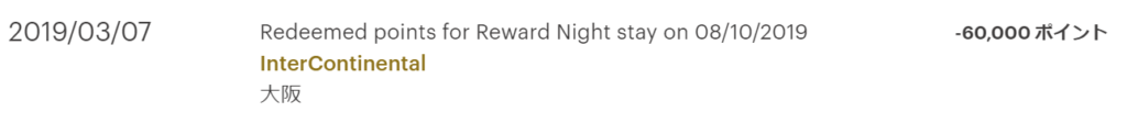 今回は貯めていたIHGリワーズクラブのポイントを利用してポイント宿泊(リワードナイト)でした。インターコンチネンタルホテル大阪のポイント宿泊に必要なポイントは60000ポイントとなっています