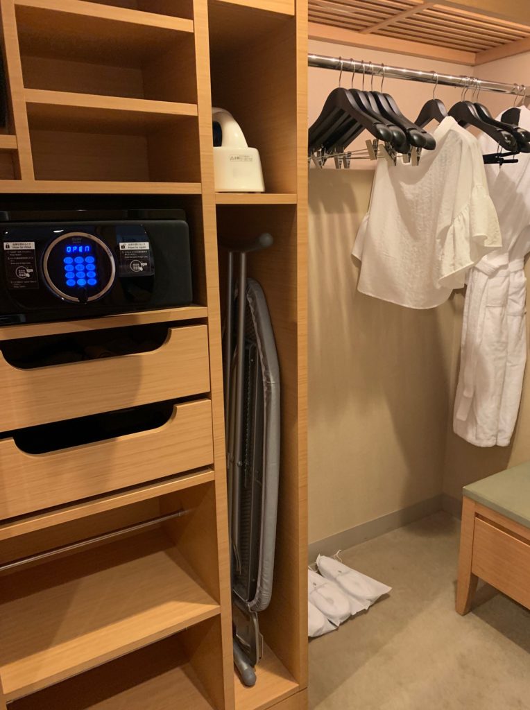 ミニバーの裏手はウォークインクローゼットとなっています。アイロンやアイロン台、バスローブ、スリッパ、セーフティボックスがあります